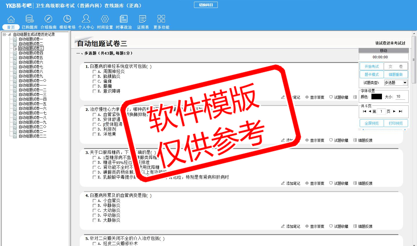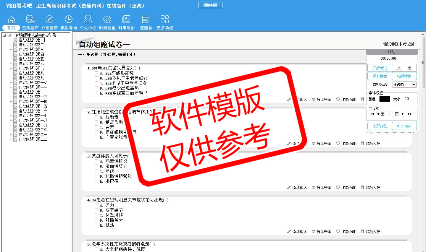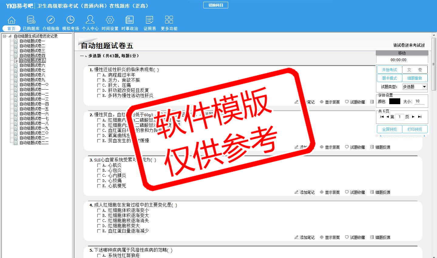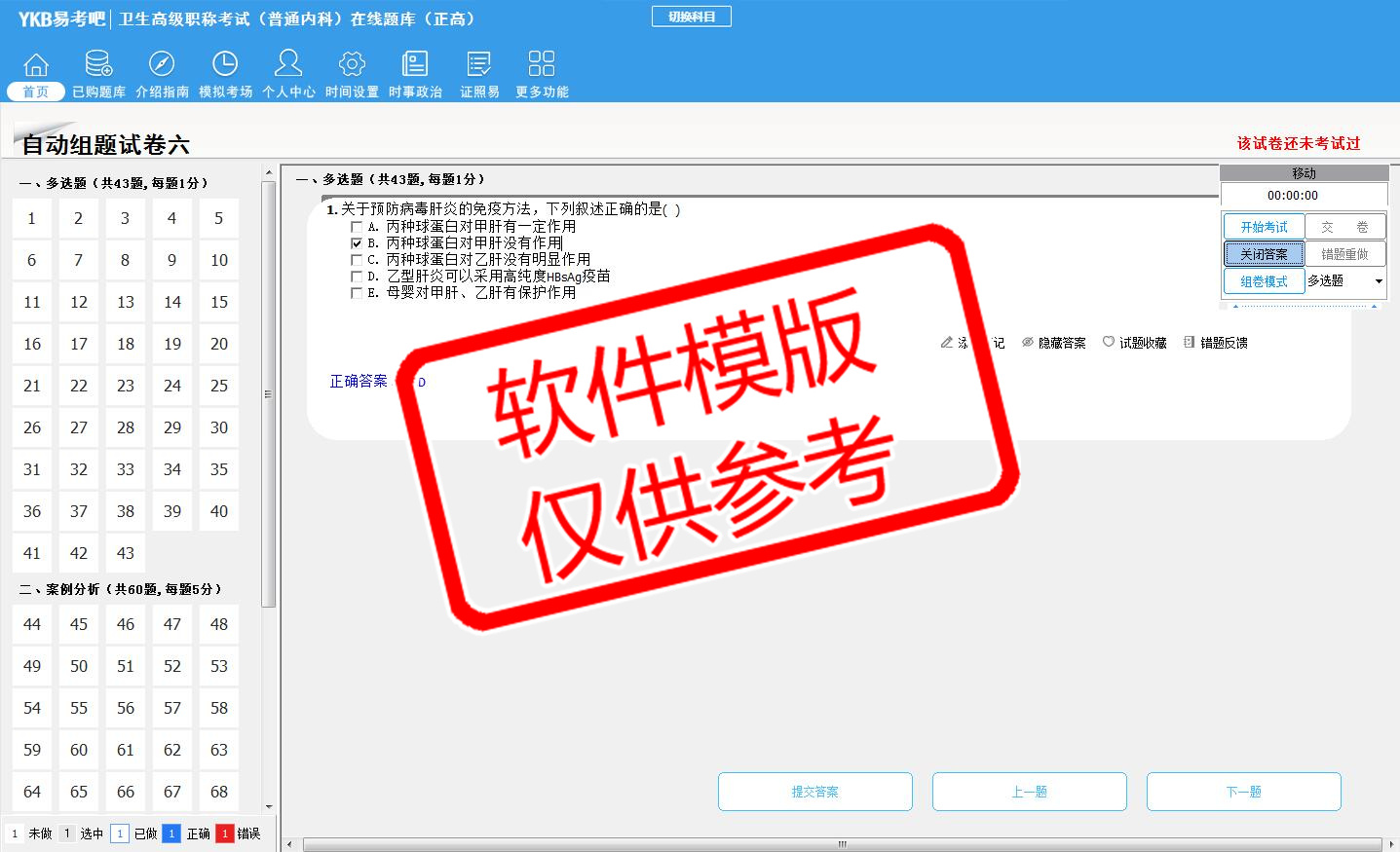 2026年卫生高级职称考试(普通内科·代码063)易考宝典软件(正高)(手机/网页版)是《易考宝典》考试系列软件之一,是专门为参加“高级职称职业资格考试”的朋友量身定做的自我测试系统,是个人、培训学校进行考试前训练、备考冲刺的提分技巧考试平台,题型丰富,图文并茂,内容全面,题库设计符合考试新大纲,海量试题。软件包括了富有价值的模拟考场,有计时打分等功能,就像亲身体会考试一样。