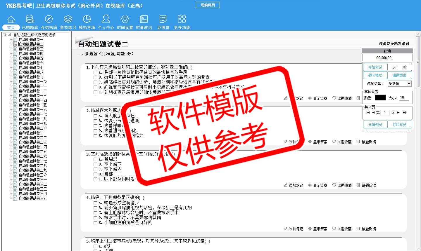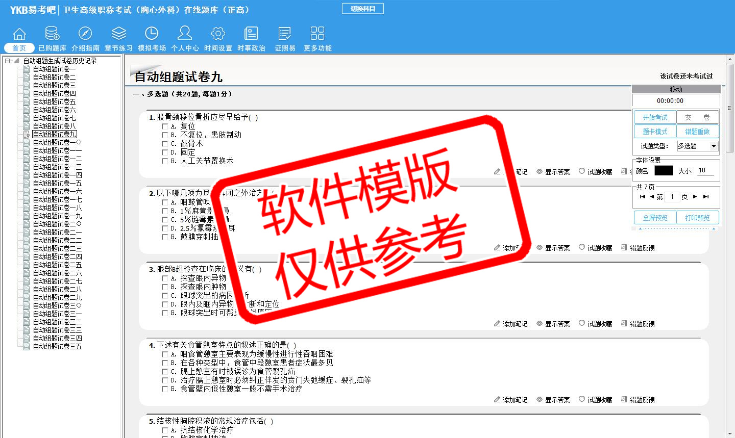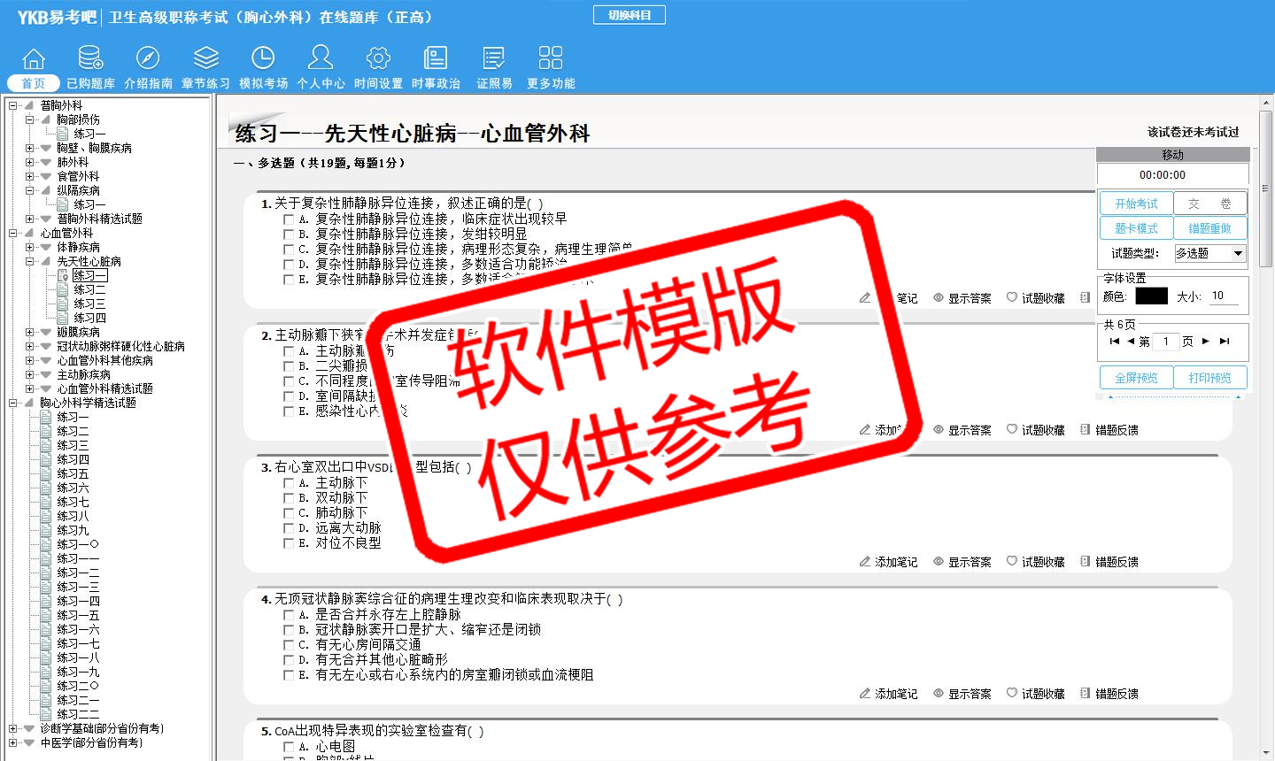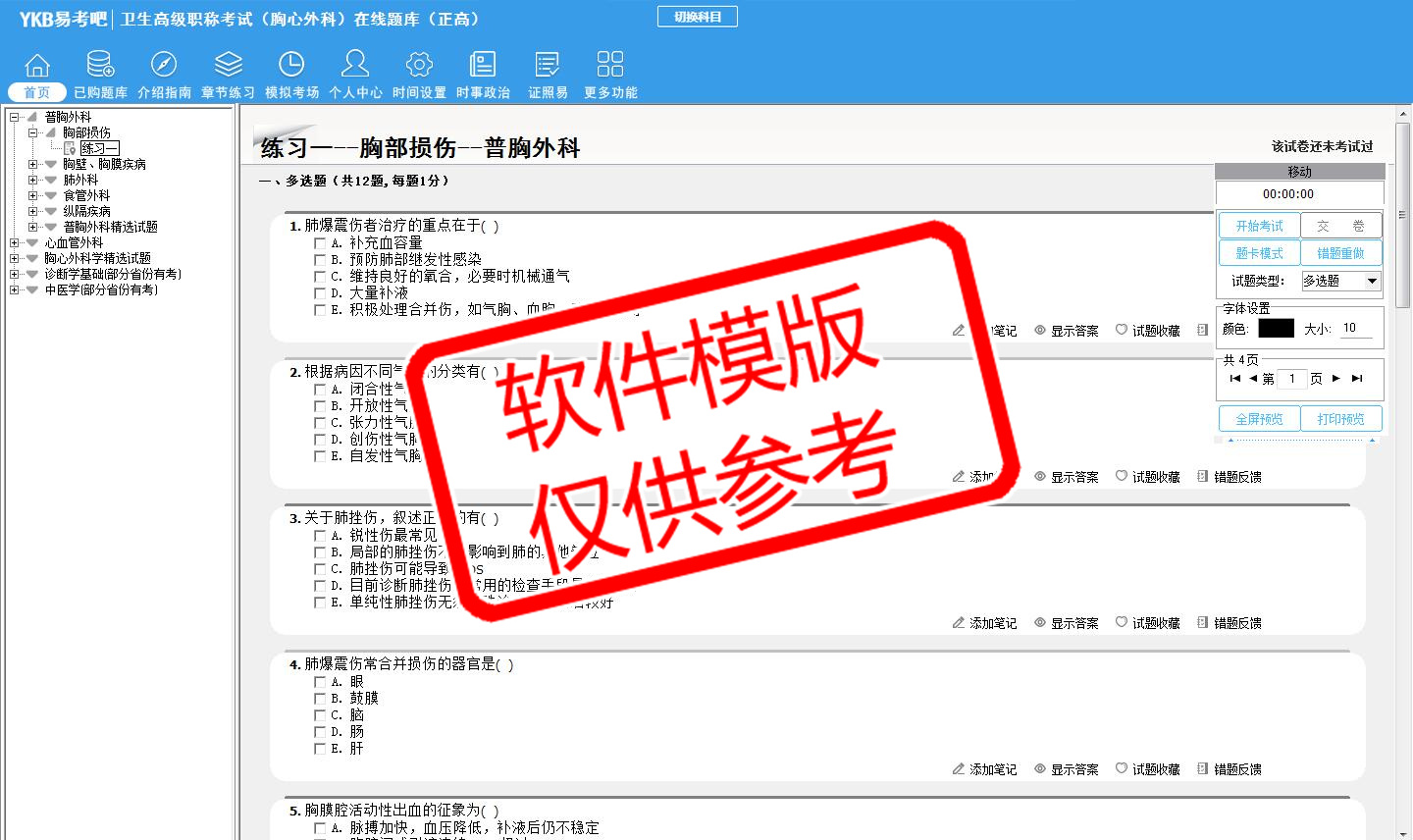 2026年卫生高级职称考试(胸心外科·代码013)易考宝典软件(正高)(手机/网页版)是《易考宝典》考试系列软件之一,是专门为参加“高级职称职业资格考试”的朋友量身定做的自我测试系统,是个人、培训学校进行考试前训练、备考冲刺的提分技巧考试平台,题型丰富,图文并茂,内容全面,题库设计符合考试新大纲,海量试题。软件包括了富有价值的模拟考场,有计时打分等功能,就像亲身体会考试一样。
