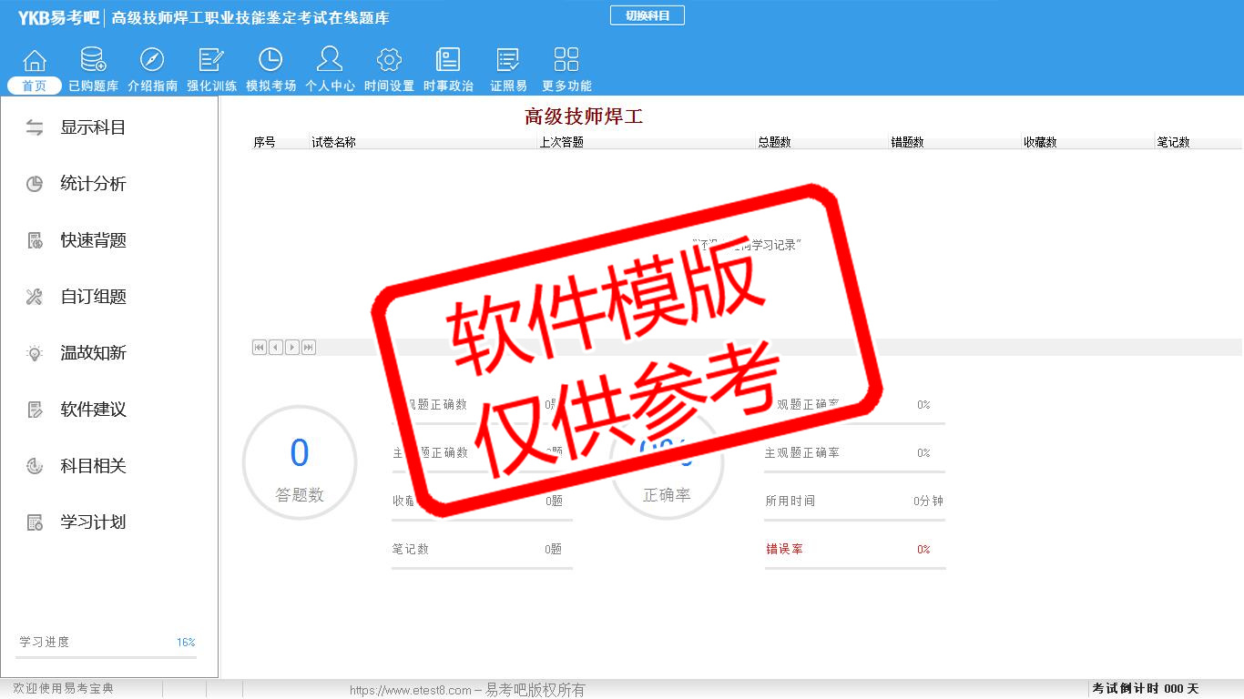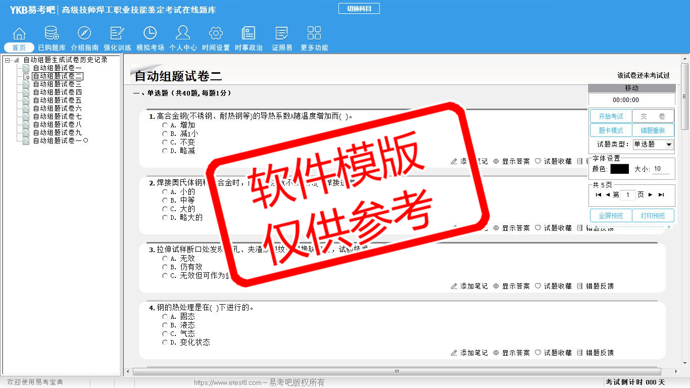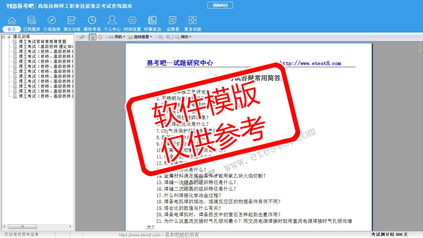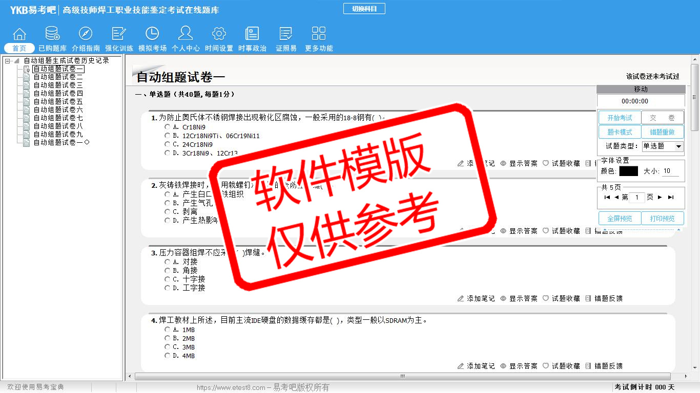2026年高级技师焊工职业技能鉴定考试易考宝典软件(手机/网页版)是《易考宝典》考试系列软件之一,是专门为参加“车钳焊工职业资格考试”的朋友量身定做的自我测试系统,是个人、培训学校进行考试前训练、备考冲刺的提分技巧考试平台,题型丰富,图文并茂,内容全面,题库设计符合考试新大纲,海量试题。软件包括了富有价值的模拟考场,有计时打分等功能,就像亲身体会考试一样。