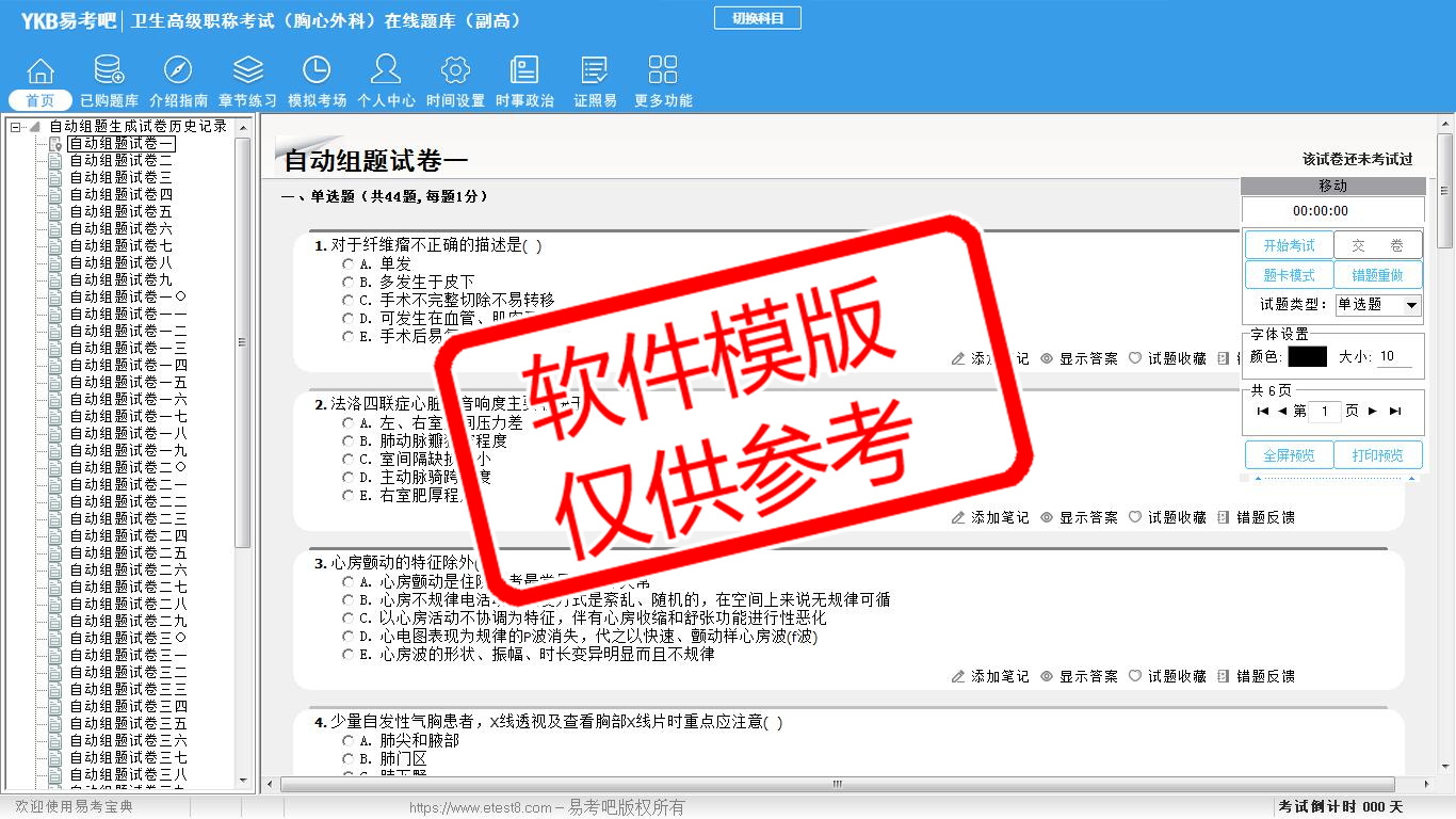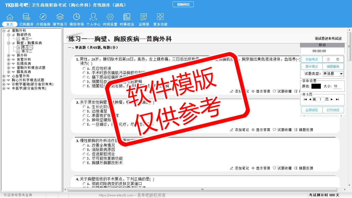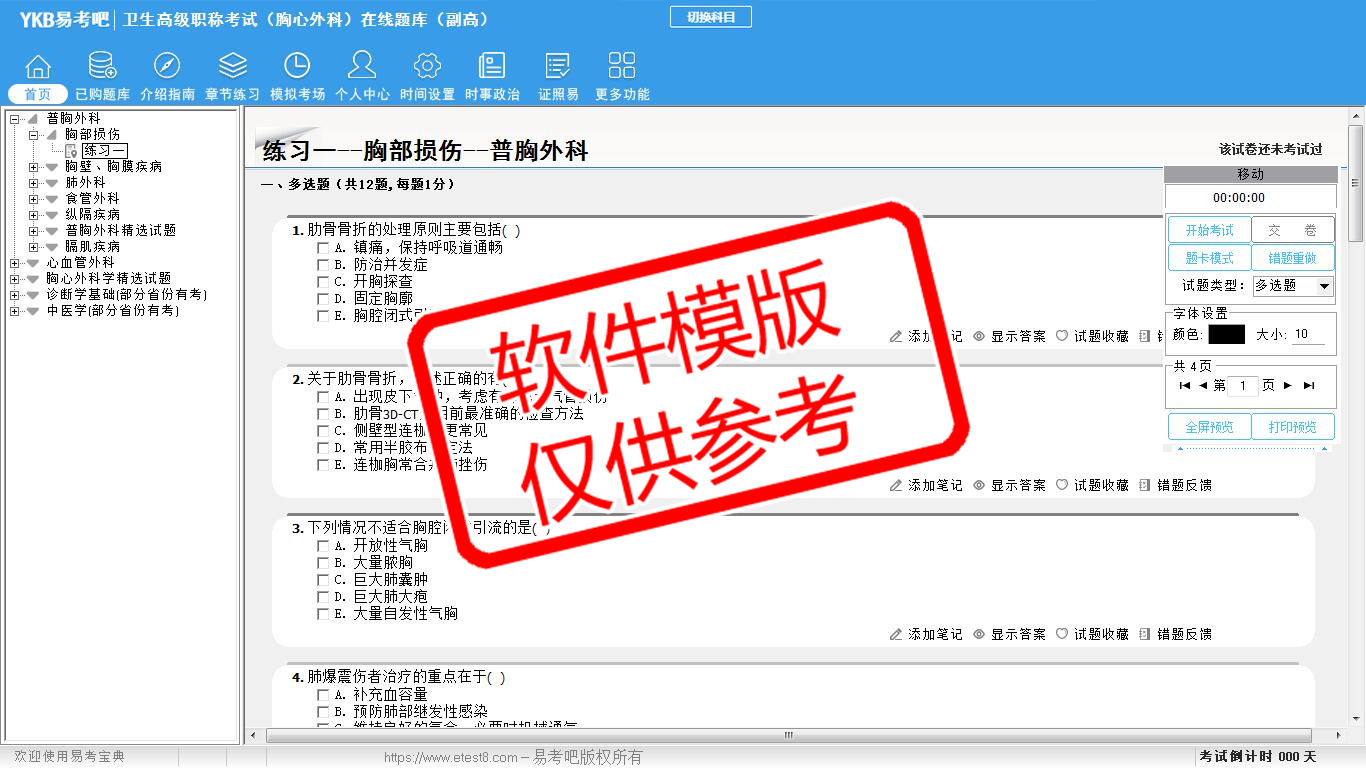 2026年卫生高级职称考试(胸心外科·代码013)易考宝典软件(副高)(手机/网页版)是《易考宝典》考试系列软件之一,是专门为参加“高级职称职业资格考试”的朋友量身定做的自我测试系统,是个人、培训学校进行考试前训练、备考冲刺的提分技巧考试平台,题型丰富,图文并茂,内容全面,题库设计符合考试新大纲,海量试题。软件包括了富有价值的模拟考场,有计时打分等功能,就像亲身体会考试一样。