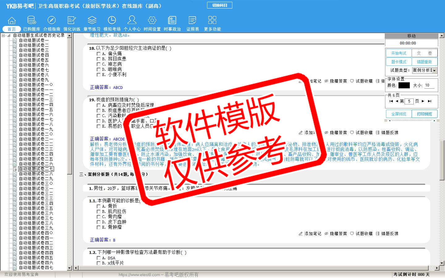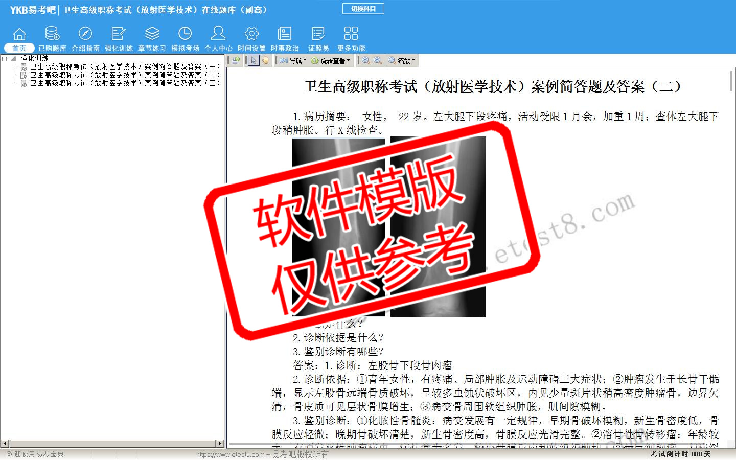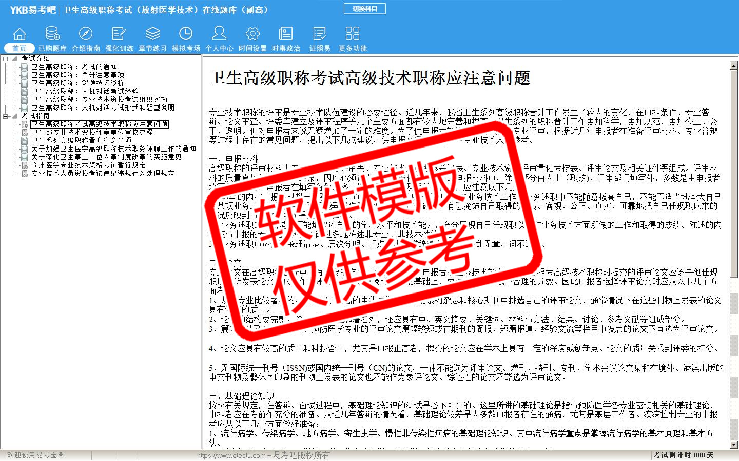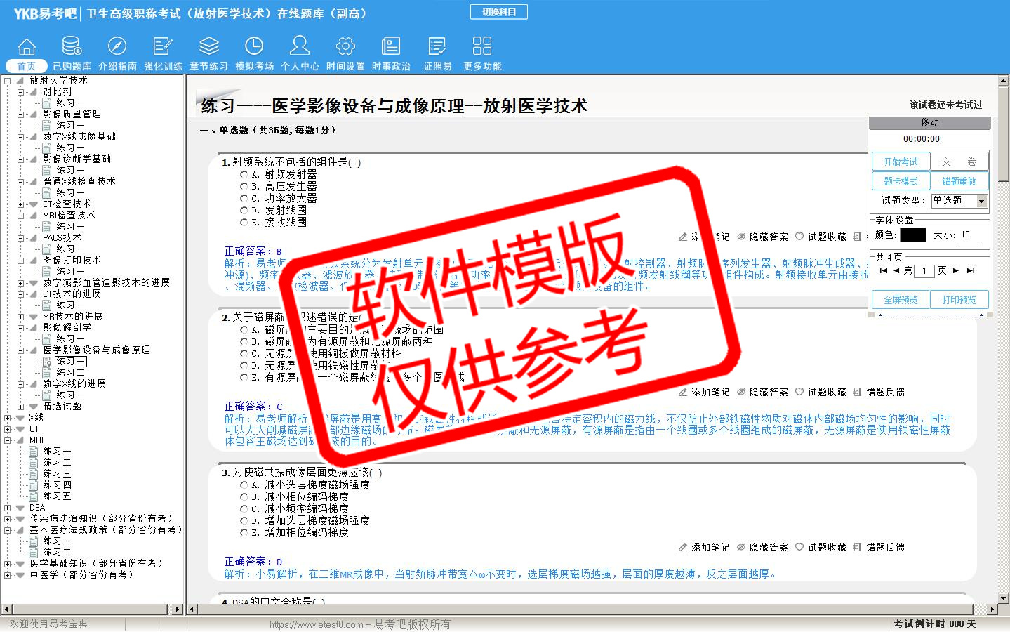 2026年卫生高级职称考试(放射医学技术·代码053)易考宝典软件(副高)(手机/网页版)是《易考宝典》考试系列软件之一,是专门为参加“高级职称职业资格考试”的朋友量身定做的自我测试系统,是个人、培训学校进行考试前训练、备考冲刺的提分技巧考试平台,题型丰富,图文并茂,内容全面,题库设计符合考试新大纲,海量试题。软件包括了富有价值的模拟考场,有计时打分等功能,就像亲身体会考试一样。