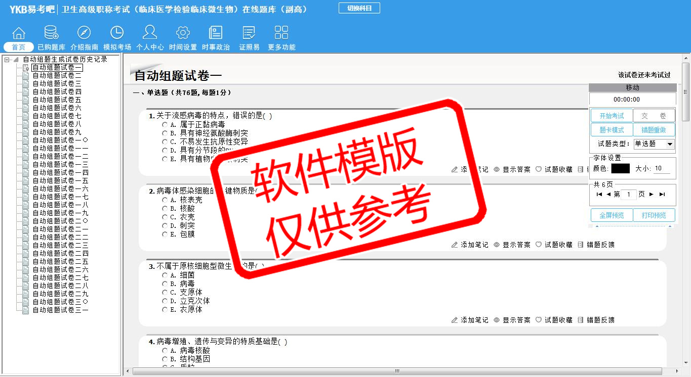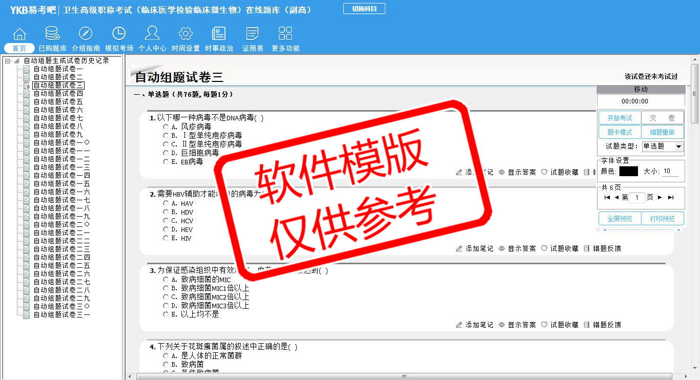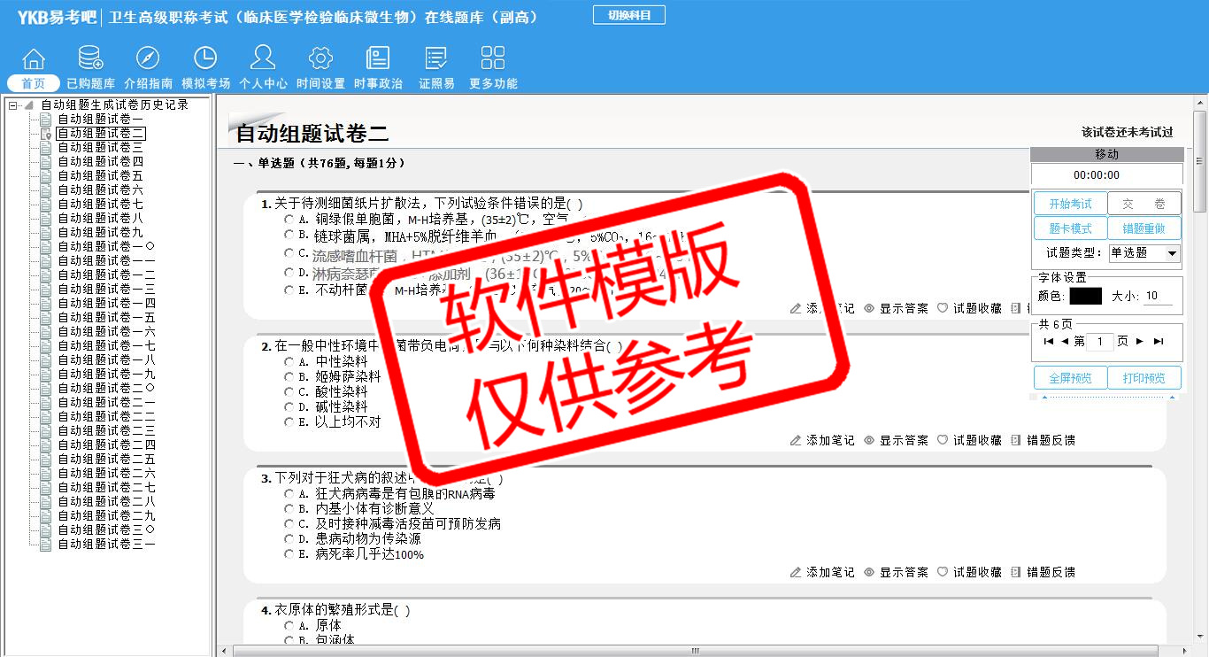 2026年卫生高级职称考试(临床医学检验临床微生物·代码043)易考宝典软件(副高)(手机/网页版)是《易考宝典》考试系列软件之一,是专门为参加“高级职称职业资格考试”的朋友量身定做的自我测试系统,是个人、培训学校进行考试前训练、备考冲刺的提分技巧考试平台,题型丰富,图文并茂,内容全面,题库设计符合考试新大纲,海量试题。软件包括了富有价值的模拟考场,有计时打分等功能,就像亲身体会考试一样。
