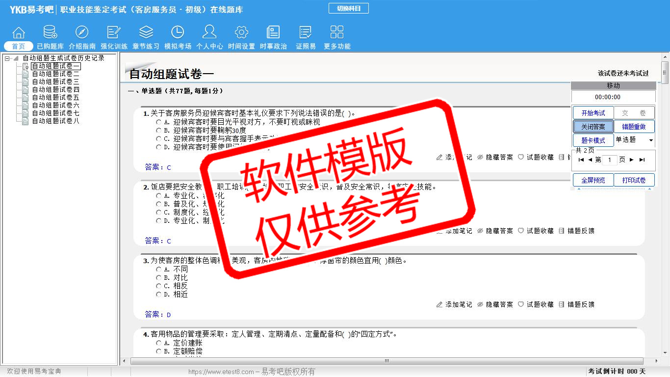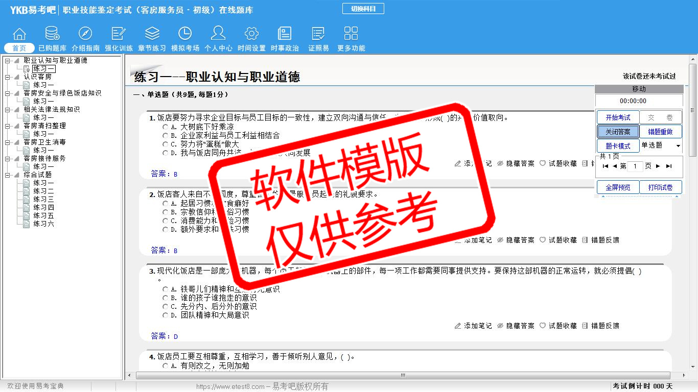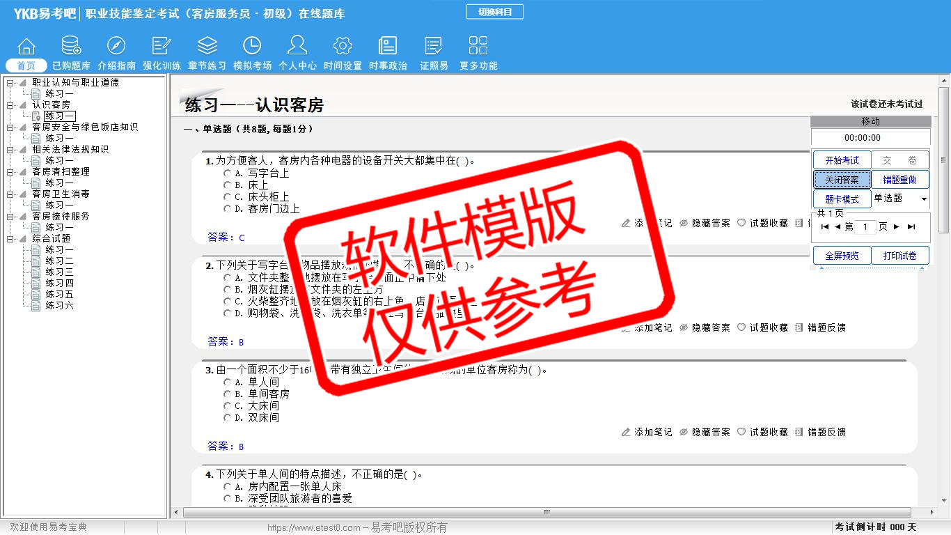 2026年职业技能鉴定考试(客房服务员·初级)易考宝典软件(手机/网页版)是《易考宝典》考试系列软件之一,是专门为参加“职业技能鉴定职业资格考试”的朋友量身定做的自我测试系统,是个人、培训学校进行考试前训练、备考冲刺的提分技巧考试平台,题型丰富,图文并茂,内容全面,题库设计符合考试新大纲,海量试题。软件包括了富有价值的模拟考场,有计时打分等功能,就像亲身体会考试一样。