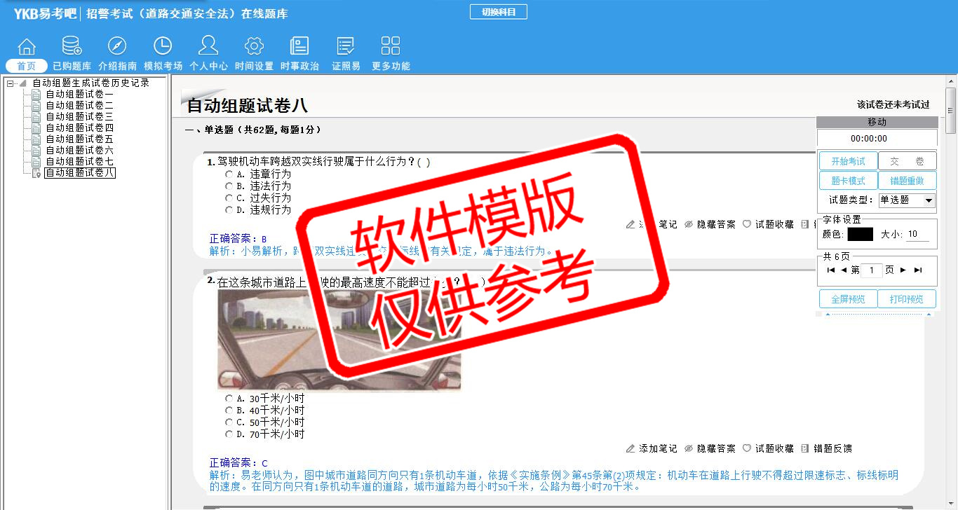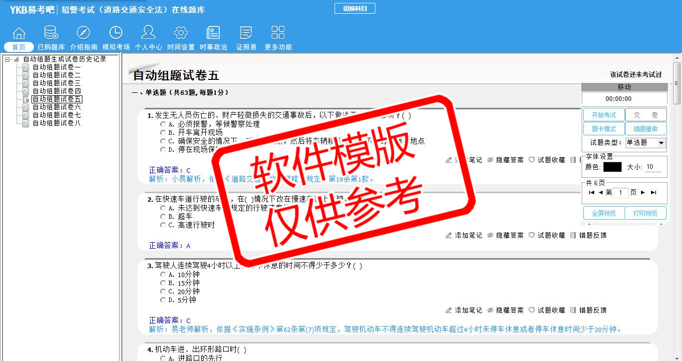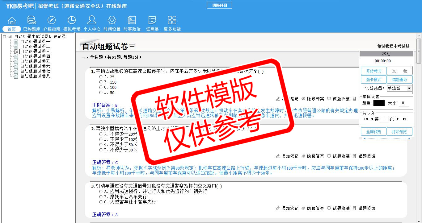 2026年招警考试(法律基础知识+道路交通安全法)易考宝典软件(手机/网页版)是《易考宝典》考试系列软件之一,是专门为参加“警法考试职业资格考试”的朋友量身定做的自我测试系统,是个人、培训学校进行考试前训练、备考冲刺的提分技巧考试平台,题型丰富,图文并茂,内容全面,题库设计符合考试新大纲,海量试题。软件包括了富有价值的模拟考场,有计时打分等功能,就像亲身体会考试一样。