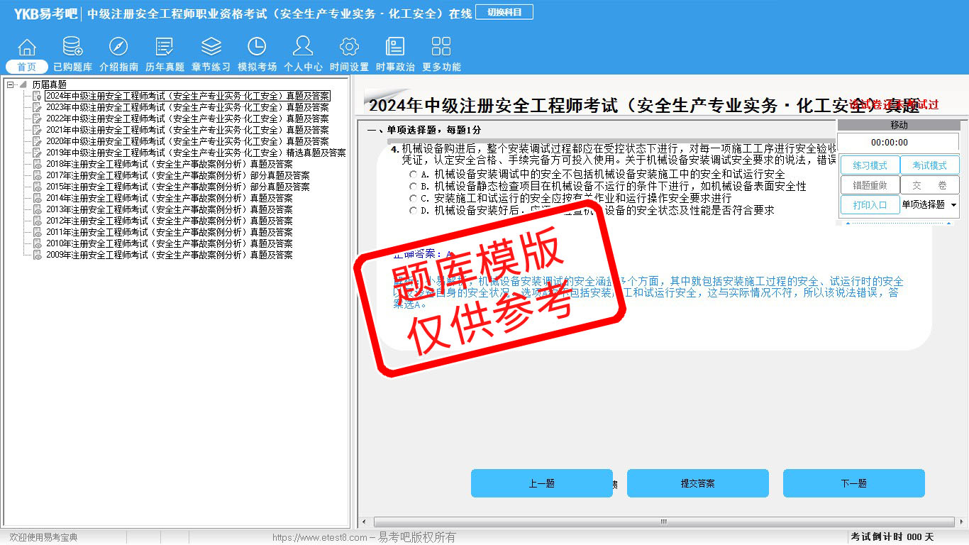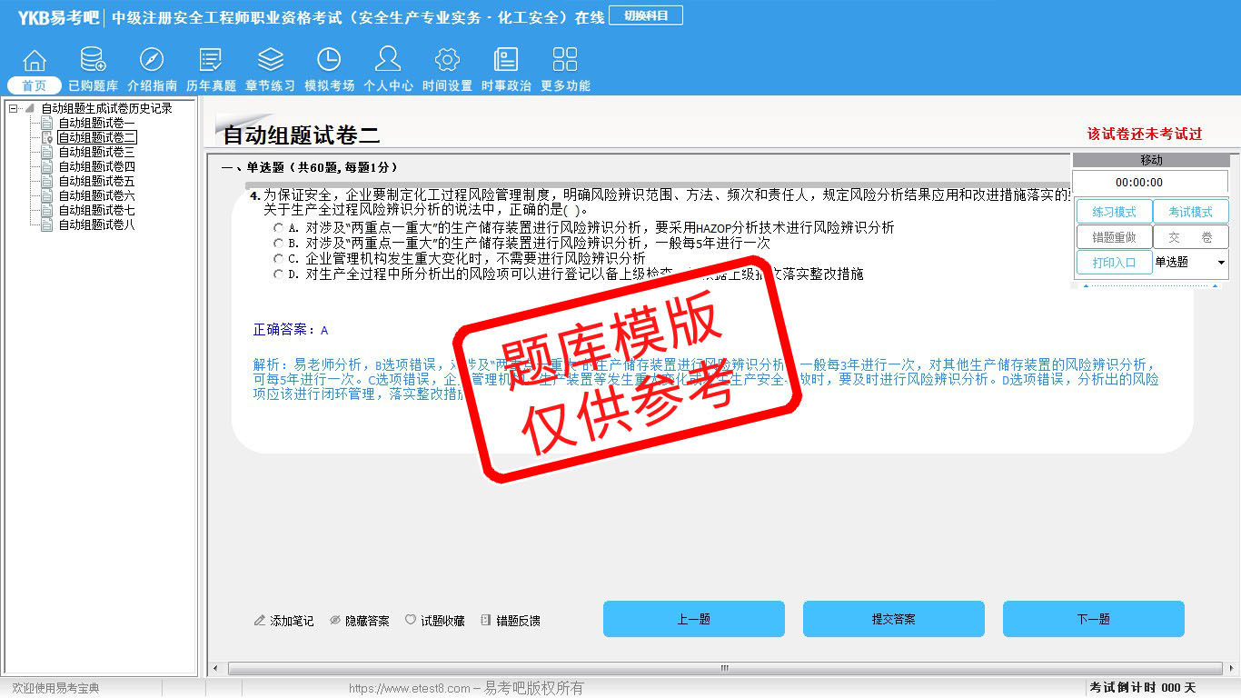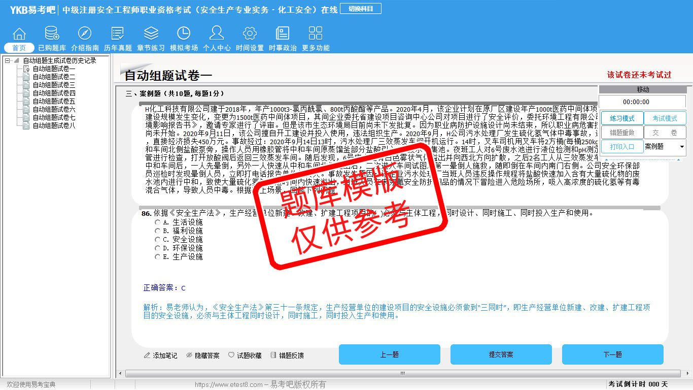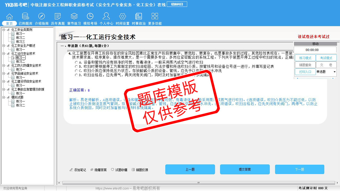 2026年中级注册安全工程师职业资格考试(安全生产专业实务·化工安全)易考宝典软件(手机/网页版)是《易考宝典》考试系列软件之一,是专门为参加“安全工程师职业资格考试”的朋友量身定做的自我测试系统,是个人、培训学校进行考试前训练、备考冲刺的提分技巧考试平台,题型丰富,图文并茂,内容全面,题库设计符合考试新大纲,海量试题。软件包括了富有价值的模拟考场,有计时打分等功能,就像亲身体会考试一样。