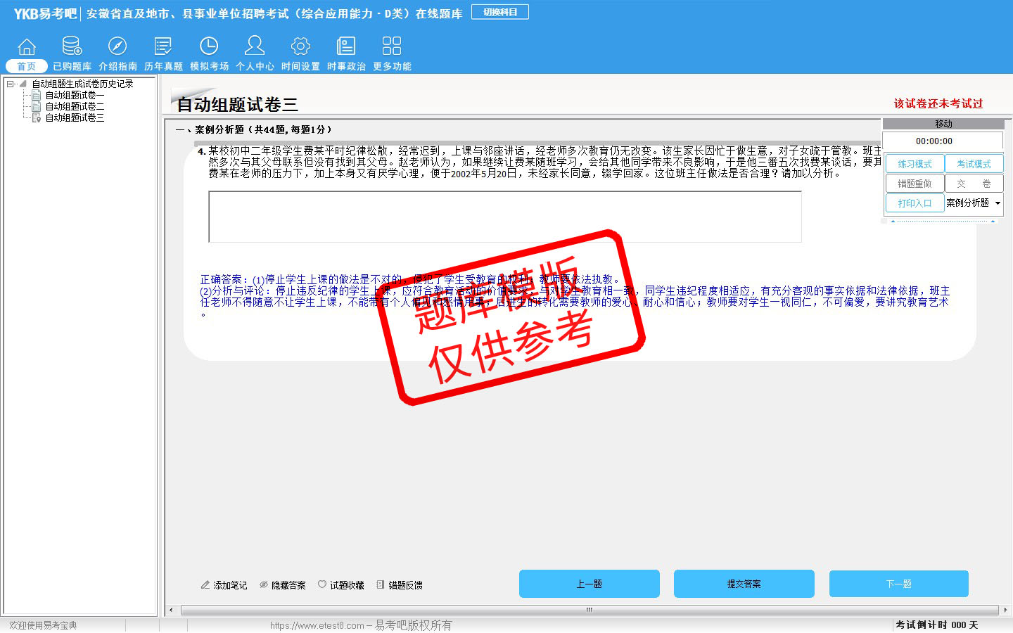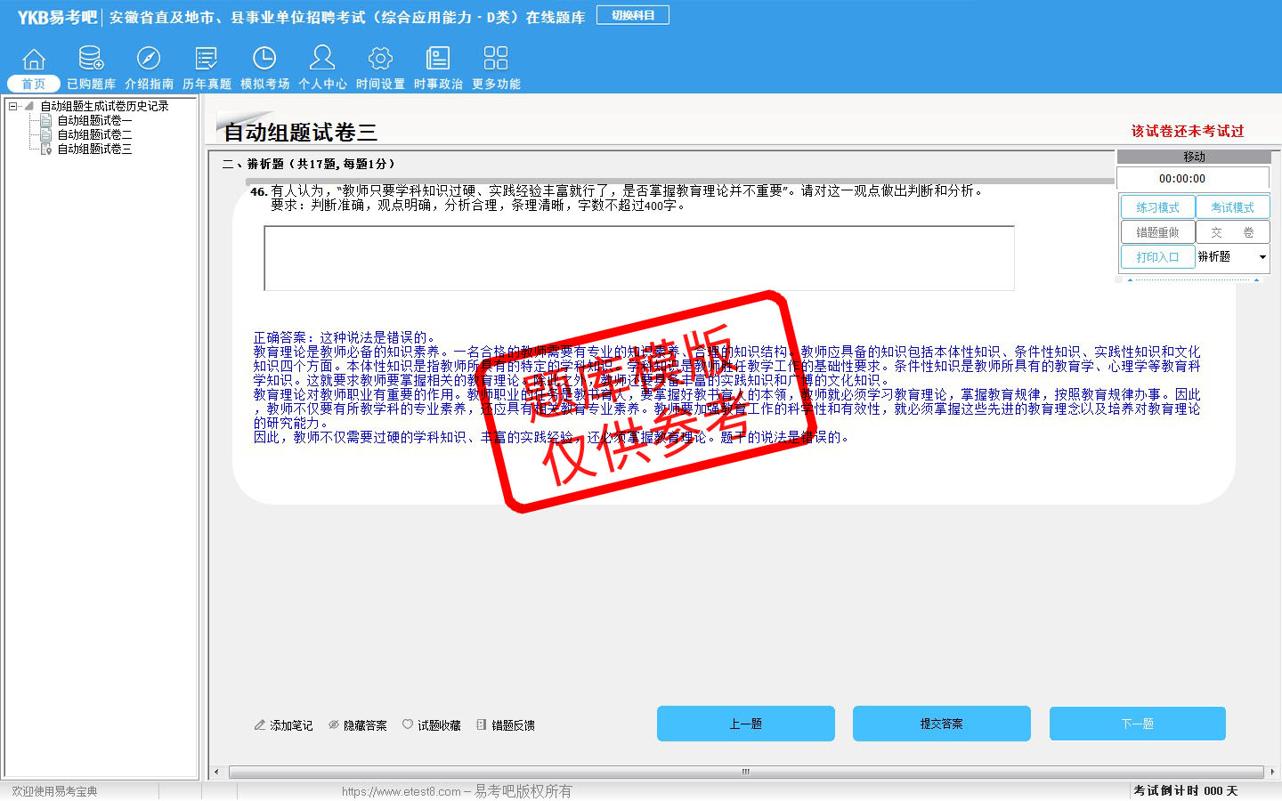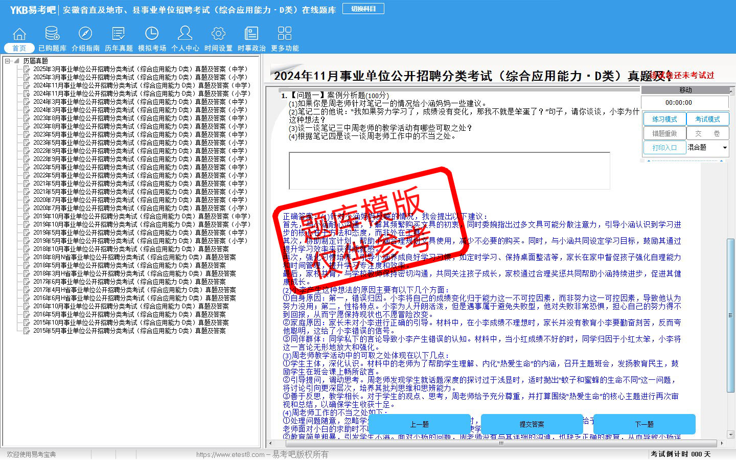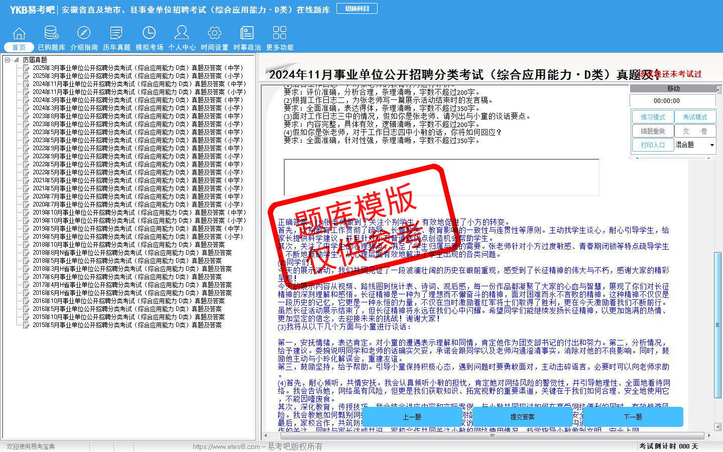 2026年安徽省直及地市、县事业单位招聘考试(中小学教师类·D类)易考宝典软件(含2科)(手机/网页版)是《易考宝典》考试系列软件之一,是专门为参加“事业单位职业资格考试”的朋友量身定做的自我测试系统,是个人、培训学校进行考试前训练、备考冲刺的提分技巧考试平台,题型丰富,图文并茂,内容全面,题库设计符合考试新大纲,海量试题。软件包括了富有价值的模拟考场,有计时打分等功能,就像亲身体会考试一样。