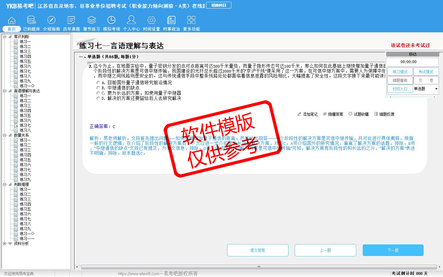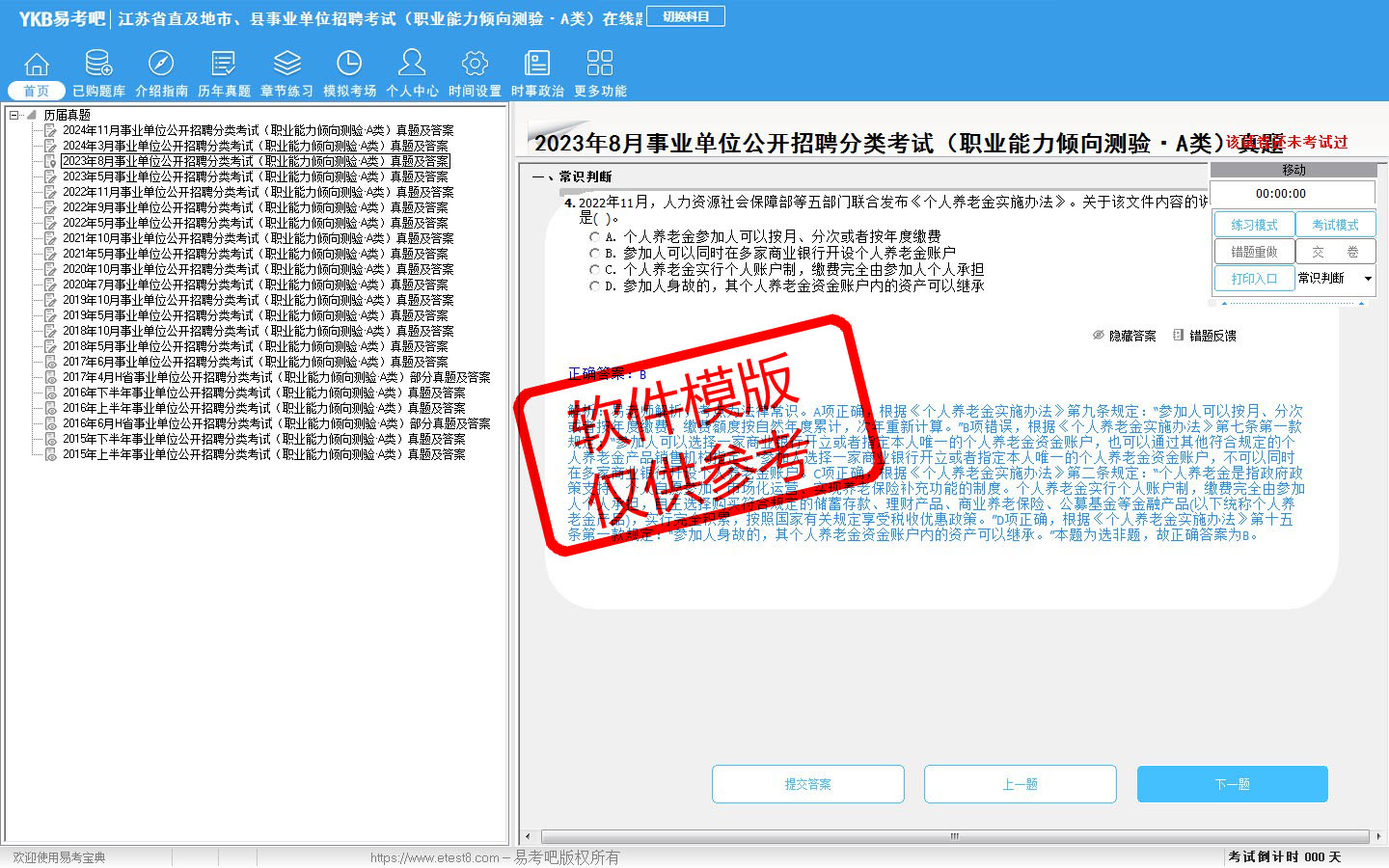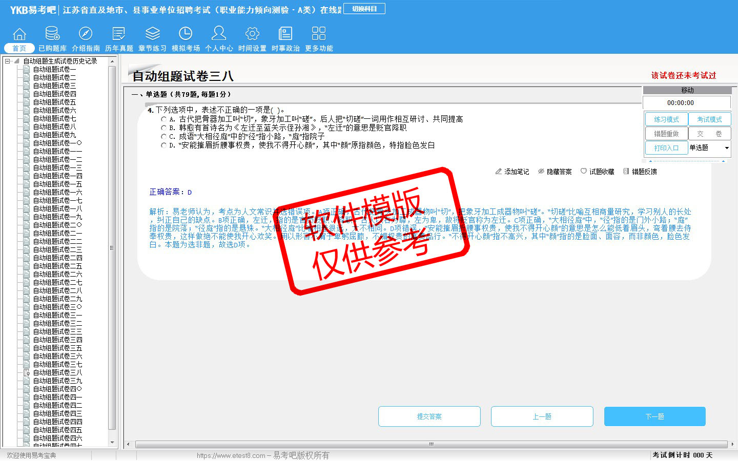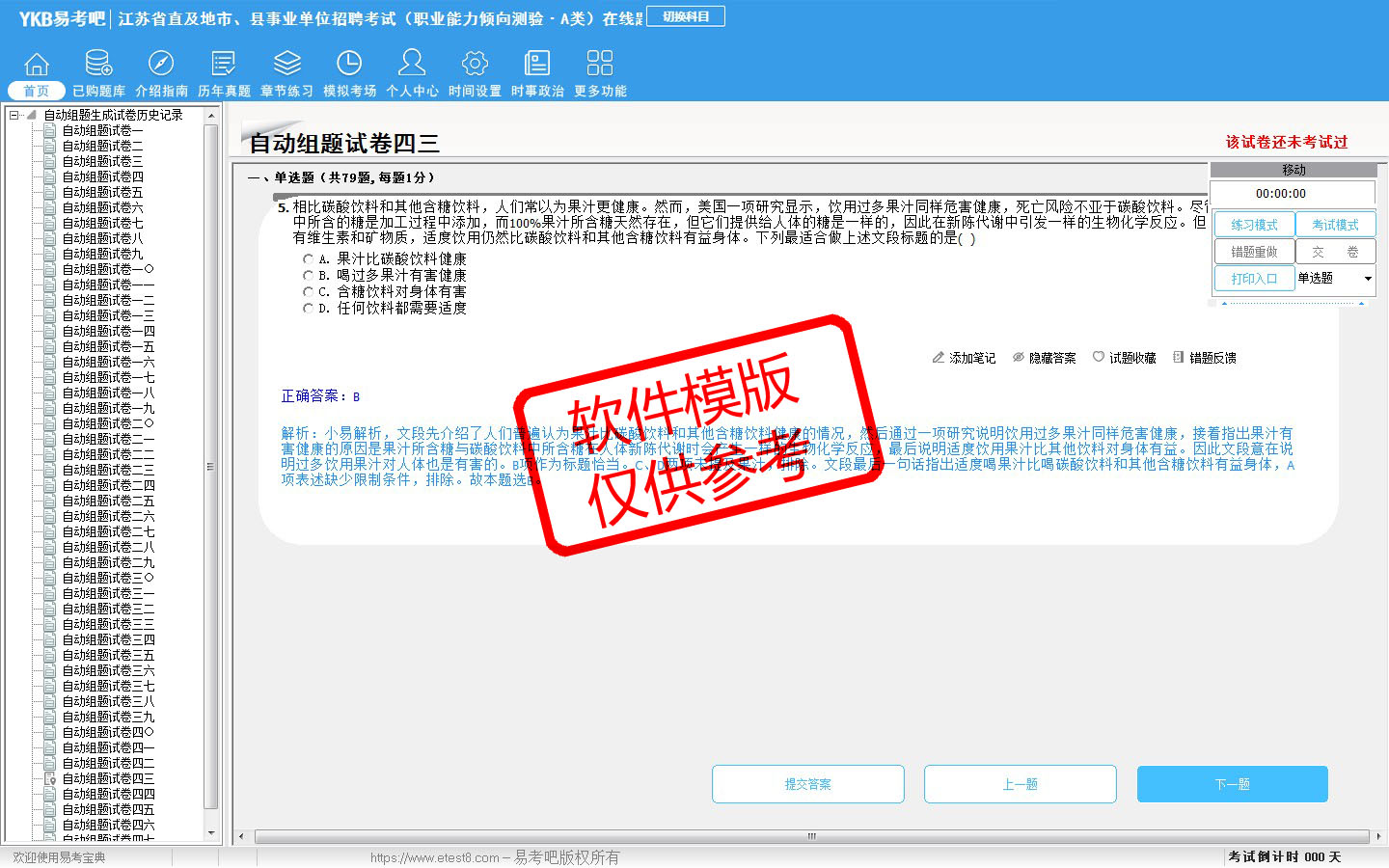 2026年江苏省直及地市、县事业单位招聘考试(综合管理类·A类)易考宝典软件(含2科)(手机/网页版)是《易考宝典》考试系列软件之一,是专门为参加“事业单位职业资格考试”的朋友量身定做的自我测试系统,是个人、培训学校进行考试前训练、备考冲刺的提分技巧考试平台,题型丰富,图文并茂,内容全面,题库设计符合考试新大纲,海量试题。软件包括了富有价值的模拟考场,有计时打分等功能,就像亲身体会考试一样。