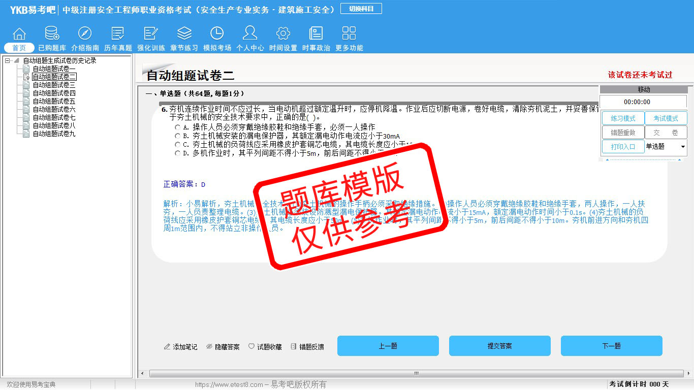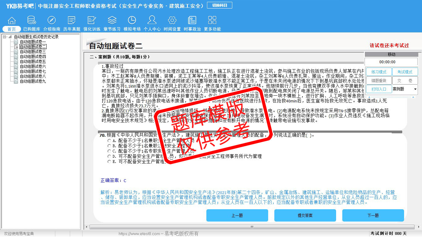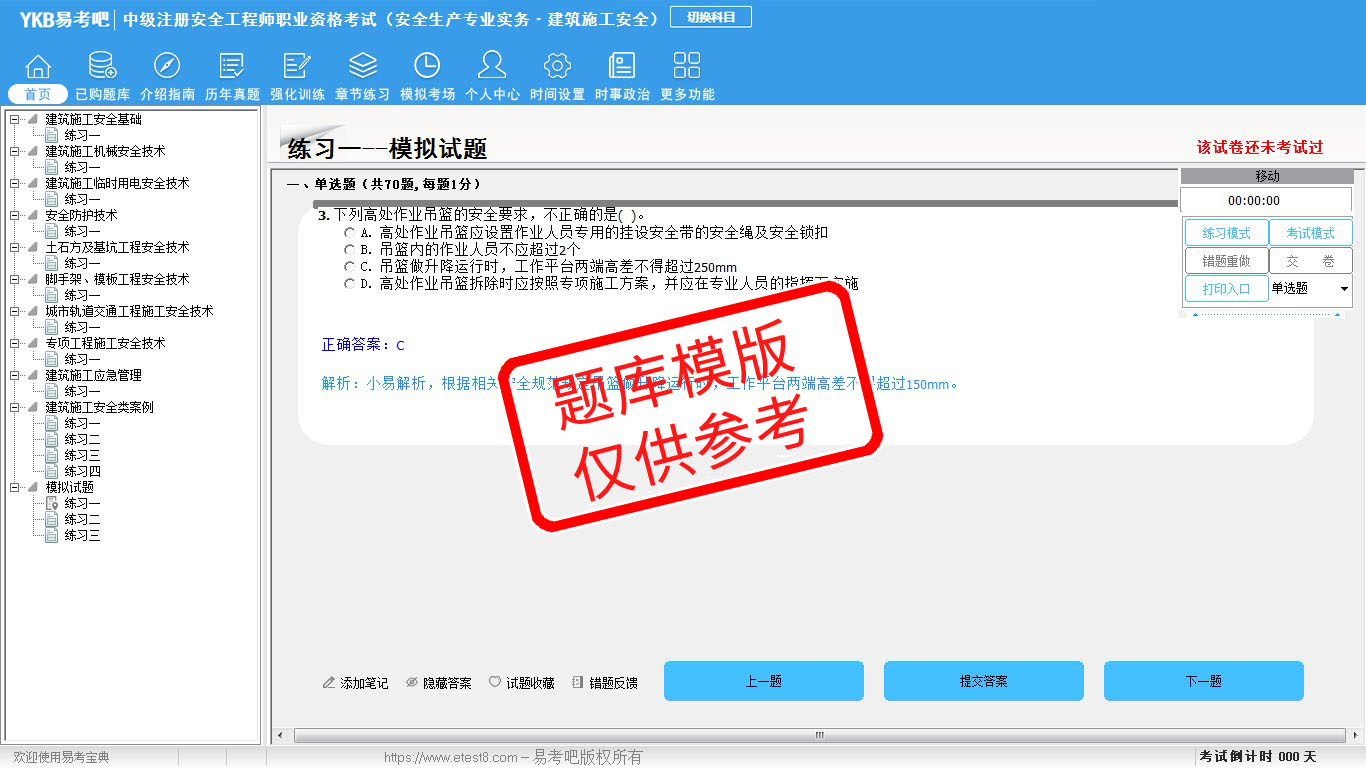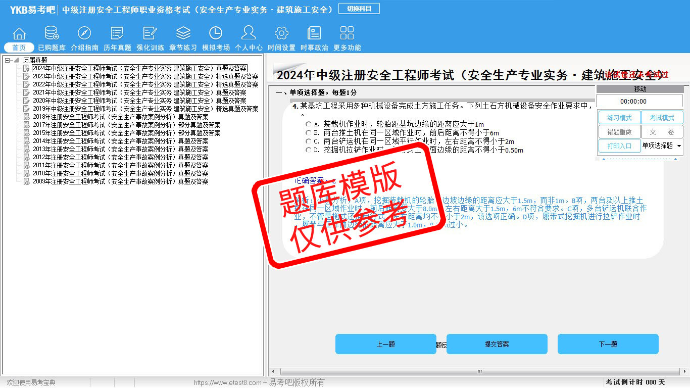 2026年中级注册安全工程师职业资格考试(公共科目+建筑施工安全)易考宝典软件(手机/网页版)是《易考宝典》考试系列软件之一,是专门为参加“安全工程师职业资格考试”的朋友量身定做的自我测试系统,是个人、培训学校进行考试前训练、备考冲刺的提分技巧考试平台,题型丰富,图文并茂,内容全面,题库设计符合考试新大纲,海量试题。软件包括了富有价值的模拟考场,有计时打分等功能,就像亲身体会考试一样。