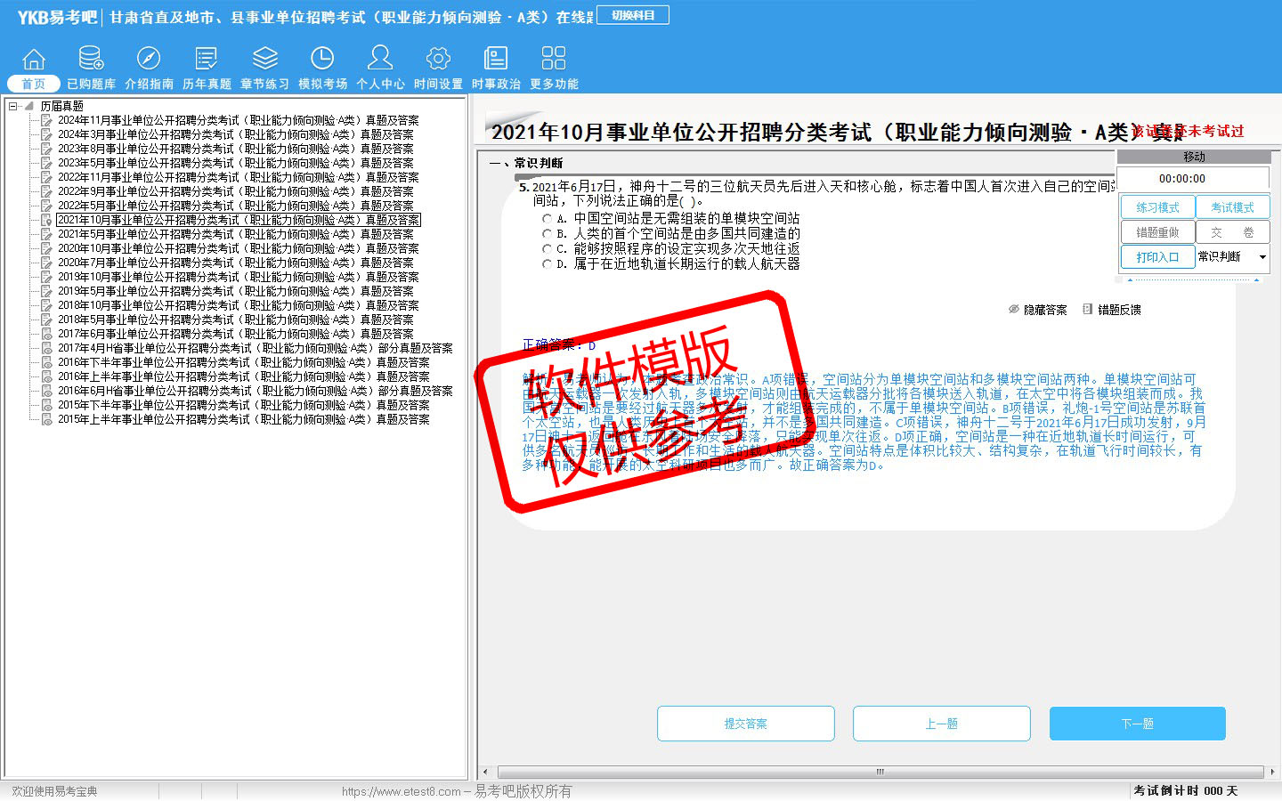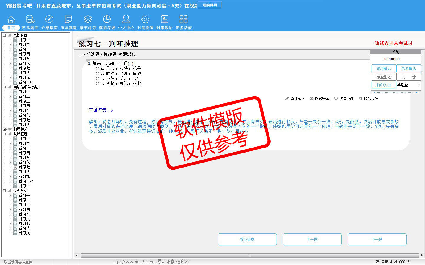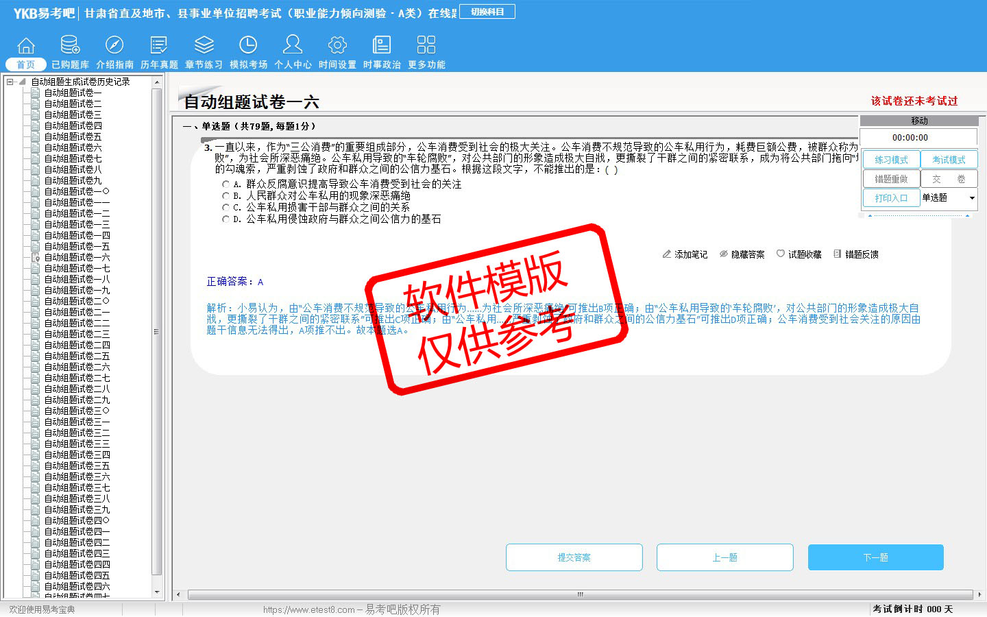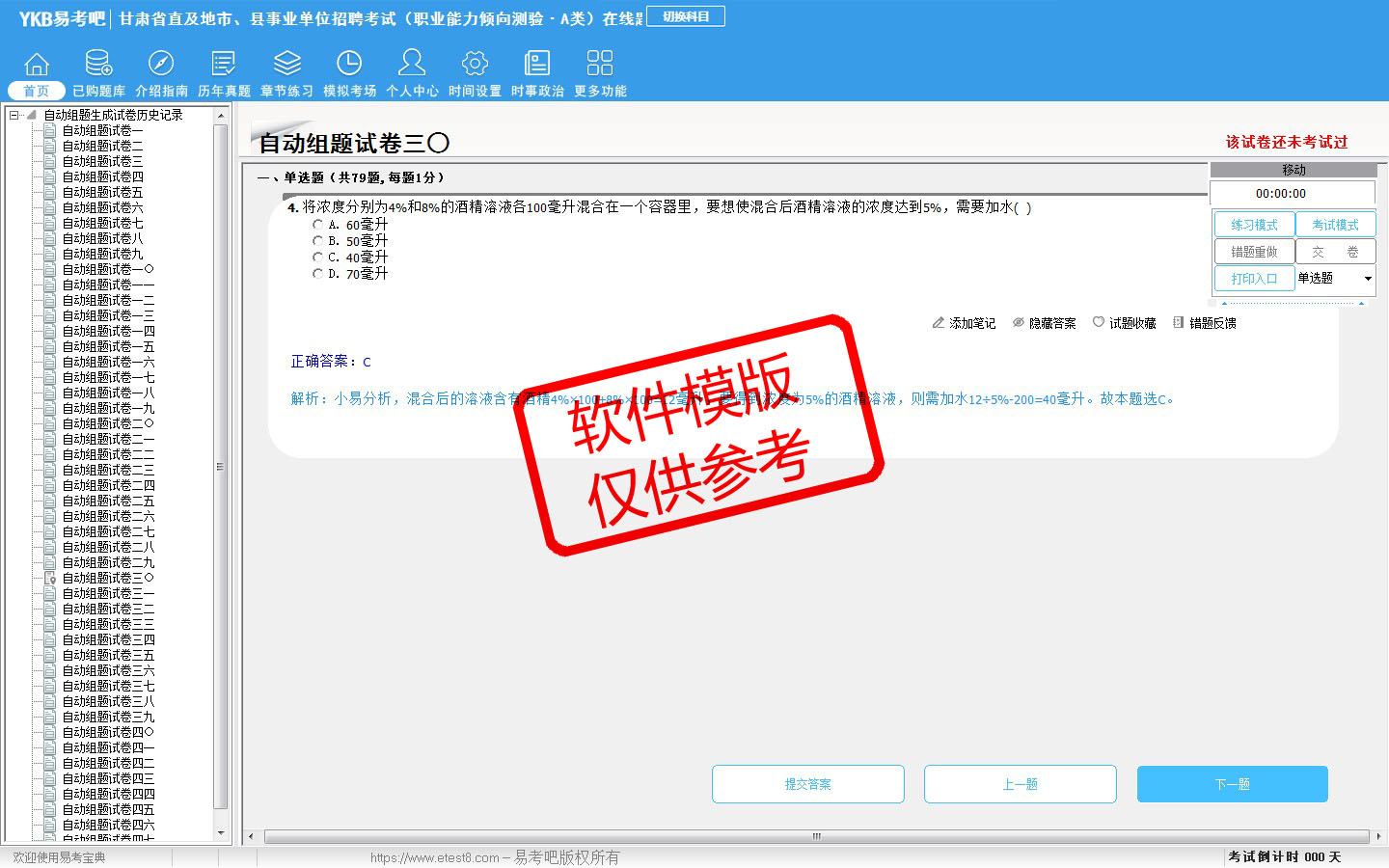 2026年甘肃省直及地市、县事业单位招聘考试(综合管理类·A类)易考宝典软件(含2科)(手机/网页版)是《易考宝典》考试系列软件之一,是专门为参加“事业单位职业资格考试”的朋友量身定做的自我测试系统,是个人、培训学校进行考试前训练、备考冲刺的提分技巧考试平台,题型丰富,图文并茂,内容全面,题库设计符合考试新大纲,海量试题。软件包括了富有价值的模拟考场,有计时打分等功能,就像亲身体会考试一样。