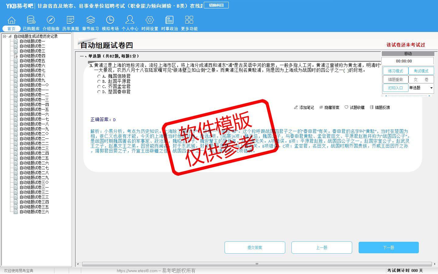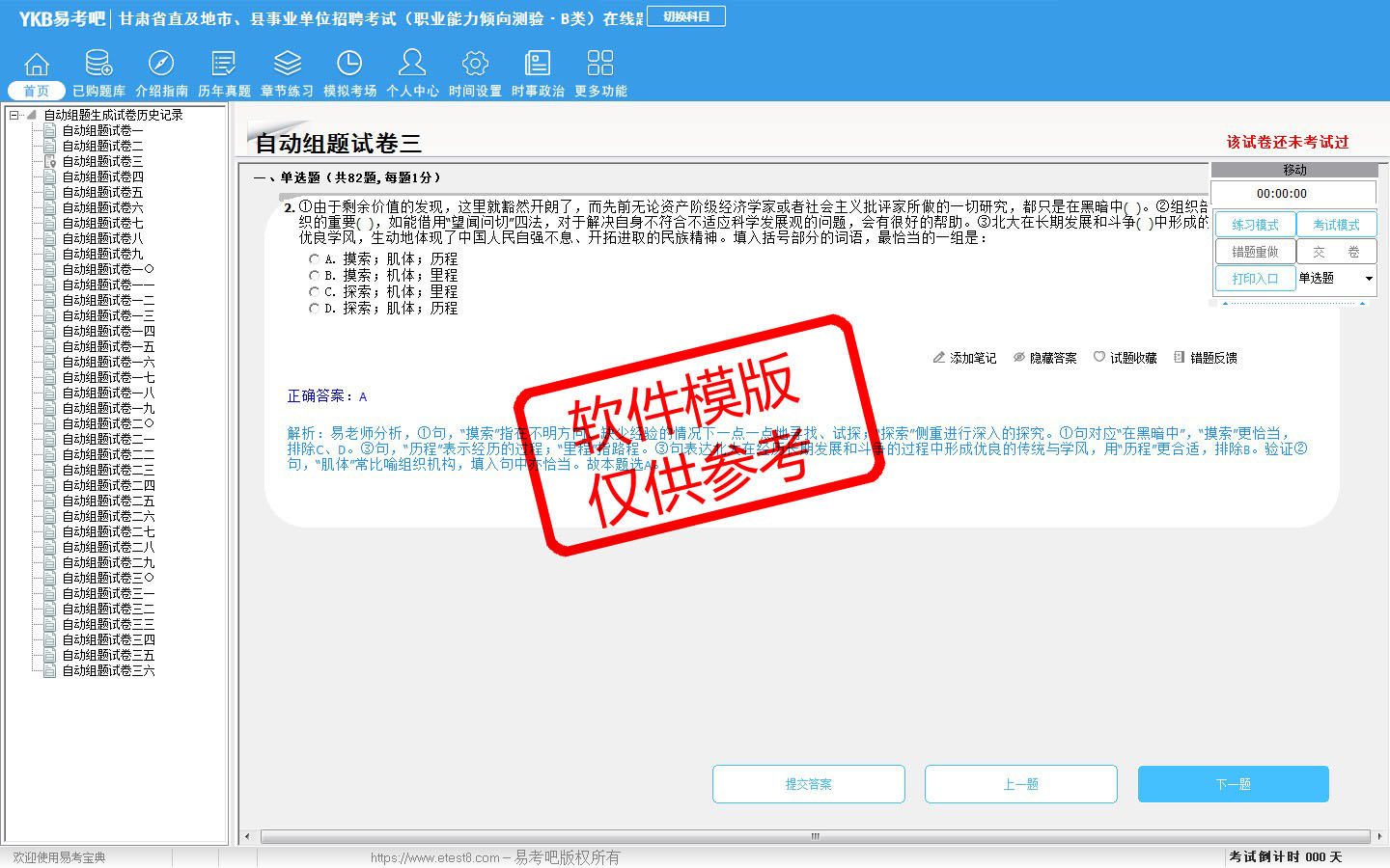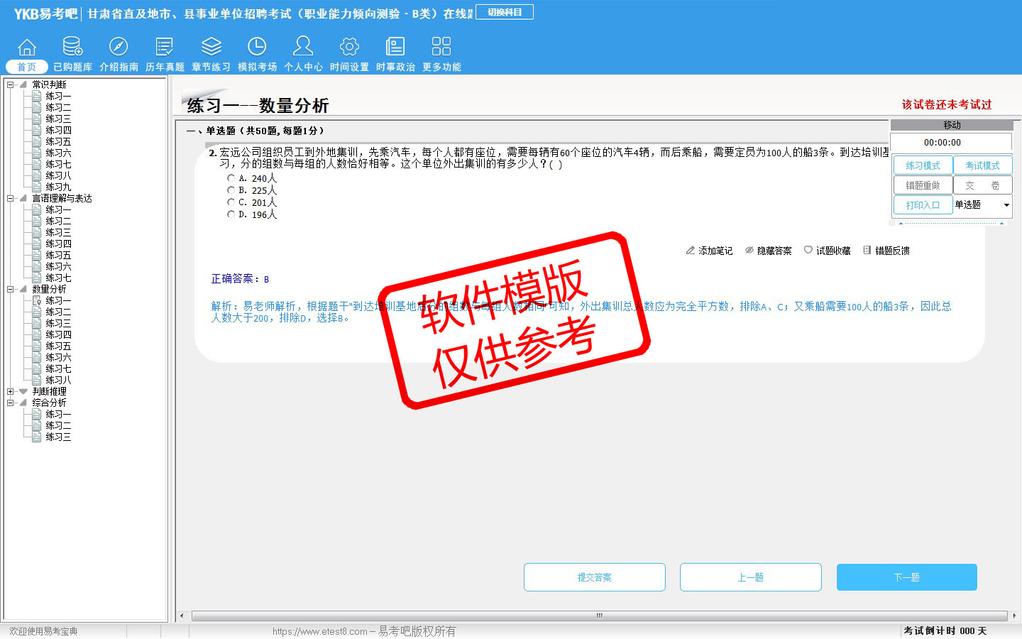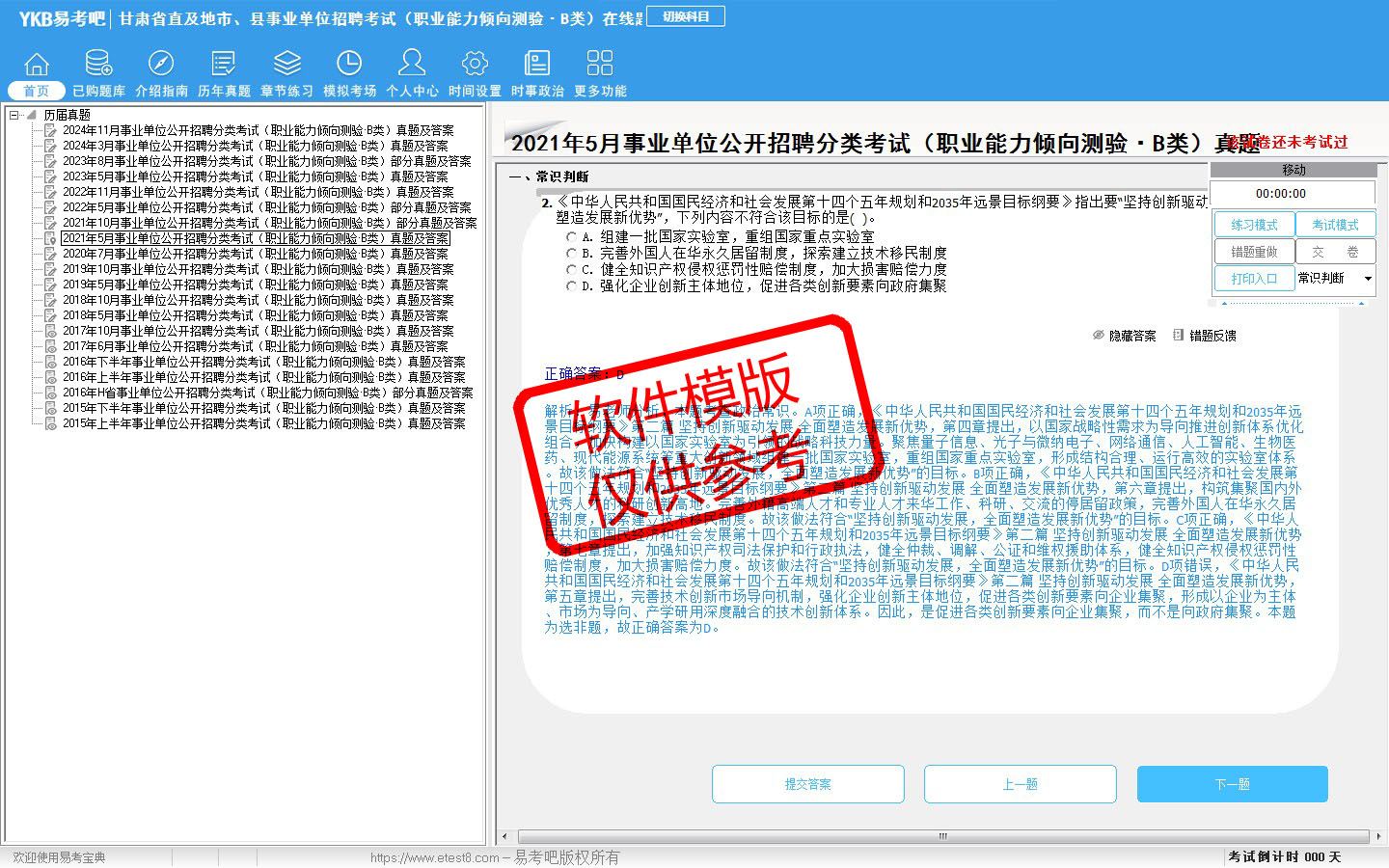 2026年甘肃省直及地市、县事业单位招聘考试(社会科学专技类·B类)易考宝典软件(含2科)(手机/网页版)是《易考宝典》考试系列软件之一,是专门为参加“事业单位职业资格考试”的朋友量身定做的自我测试系统,是个人、培训学校进行考试前训练、备考冲刺的提分技巧考试平台,题型丰富,图文并茂,内容全面,题库设计符合考试新大纲,海量试题。软件包括了富有价值的模拟考场,有计时打分等功能,就像亲身体会考试一样。