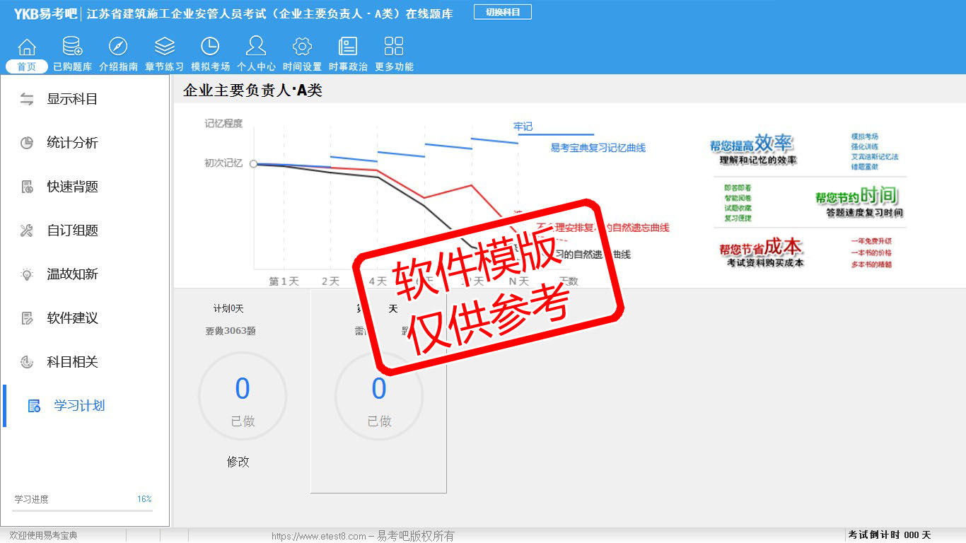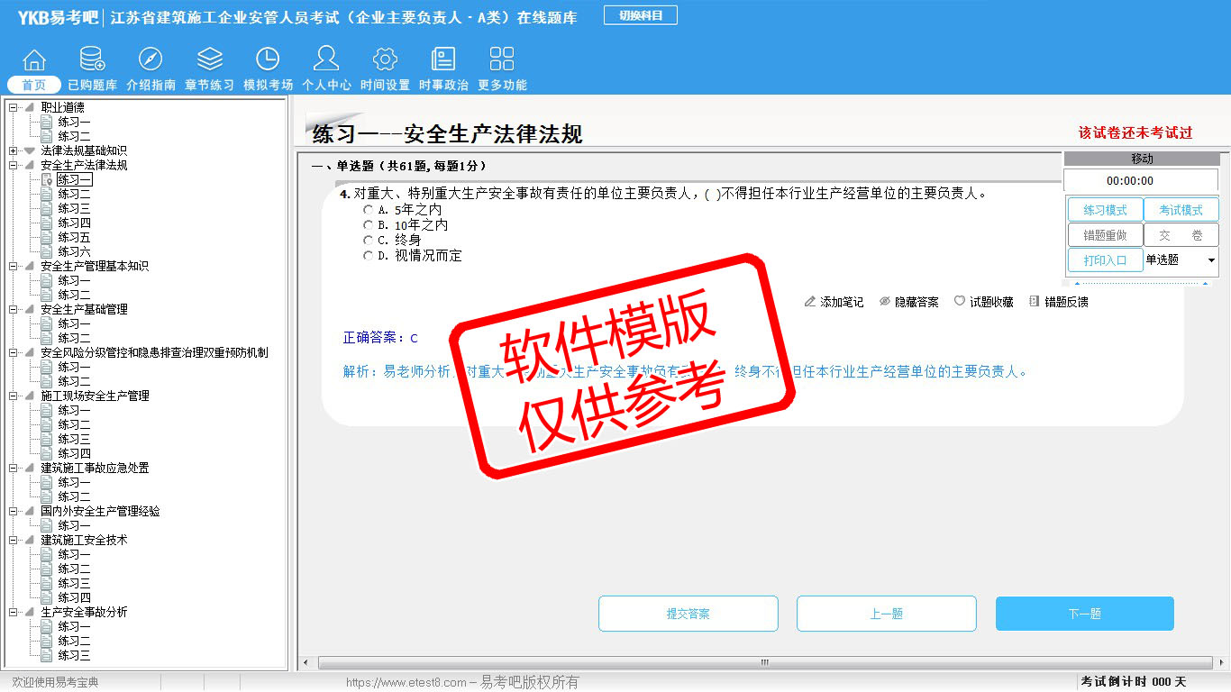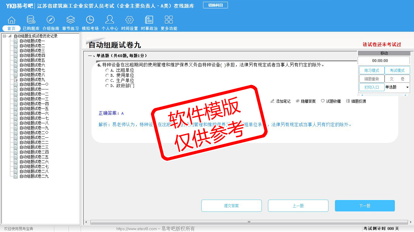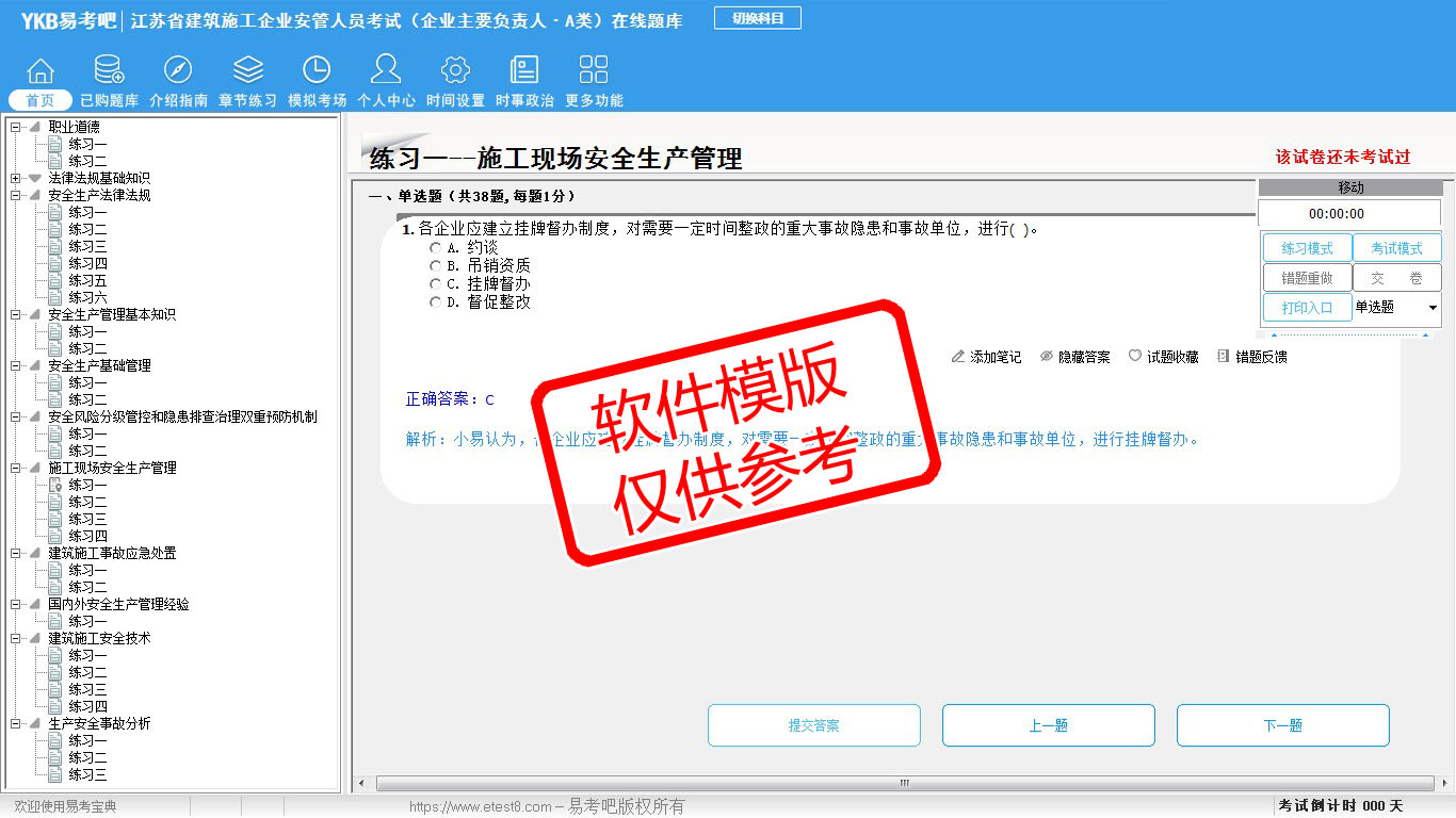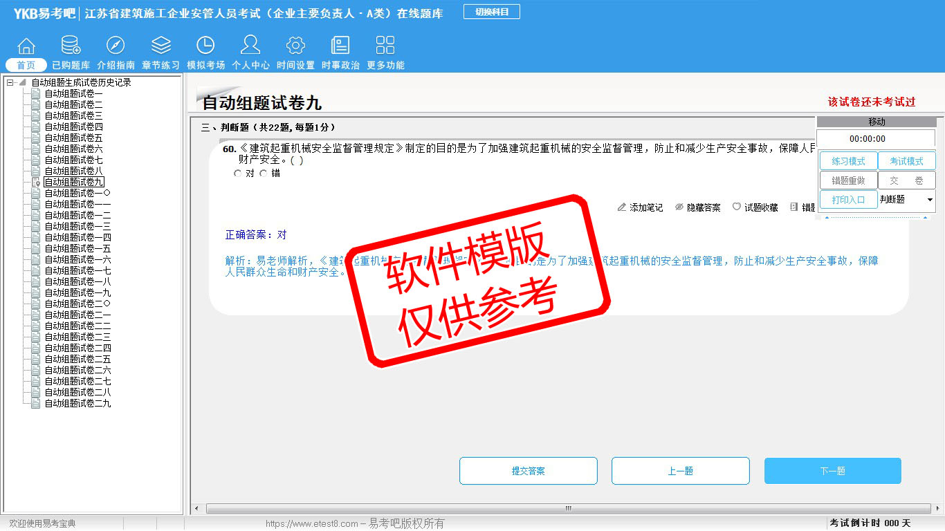 2026年江苏省建筑施工企业安管人员考试(企业主要负责人·A类)易考宝典软件(手机/网页版)是《易考宝典》考试系列软件之一,是专门为参加“安管人员职业资格考试”的朋友量身定做的自我测试系统,是个人、培训学校进行考试前训练、备考冲刺的提分技巧考试平台,题型丰富,图文并茂,内容全面,题库设计符合考试新大纲,海量试题。软件包括了富有价值的模拟考场,有计时打分等功能,就像亲身体会考试一样。