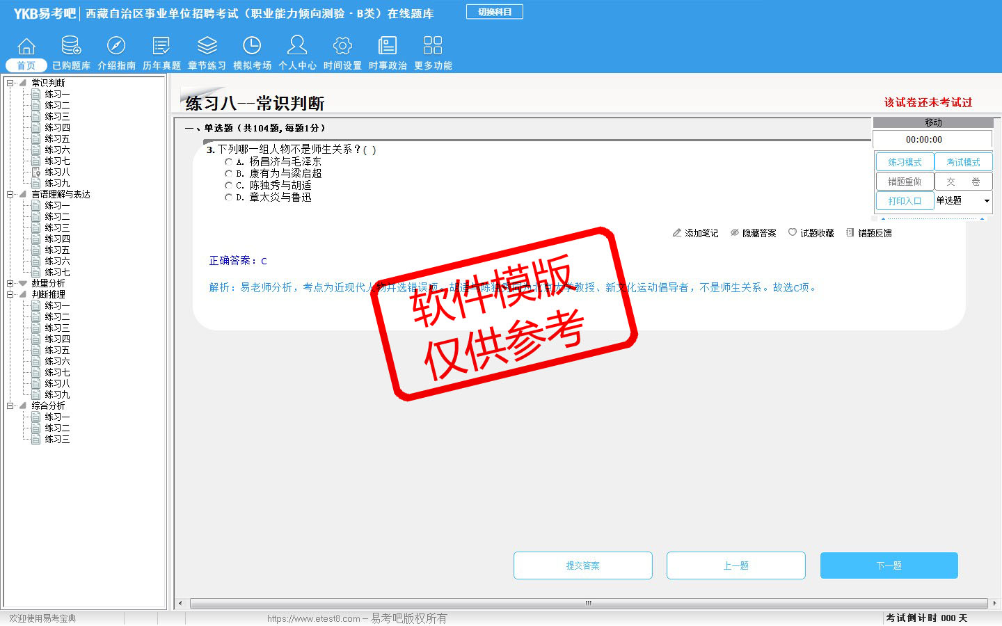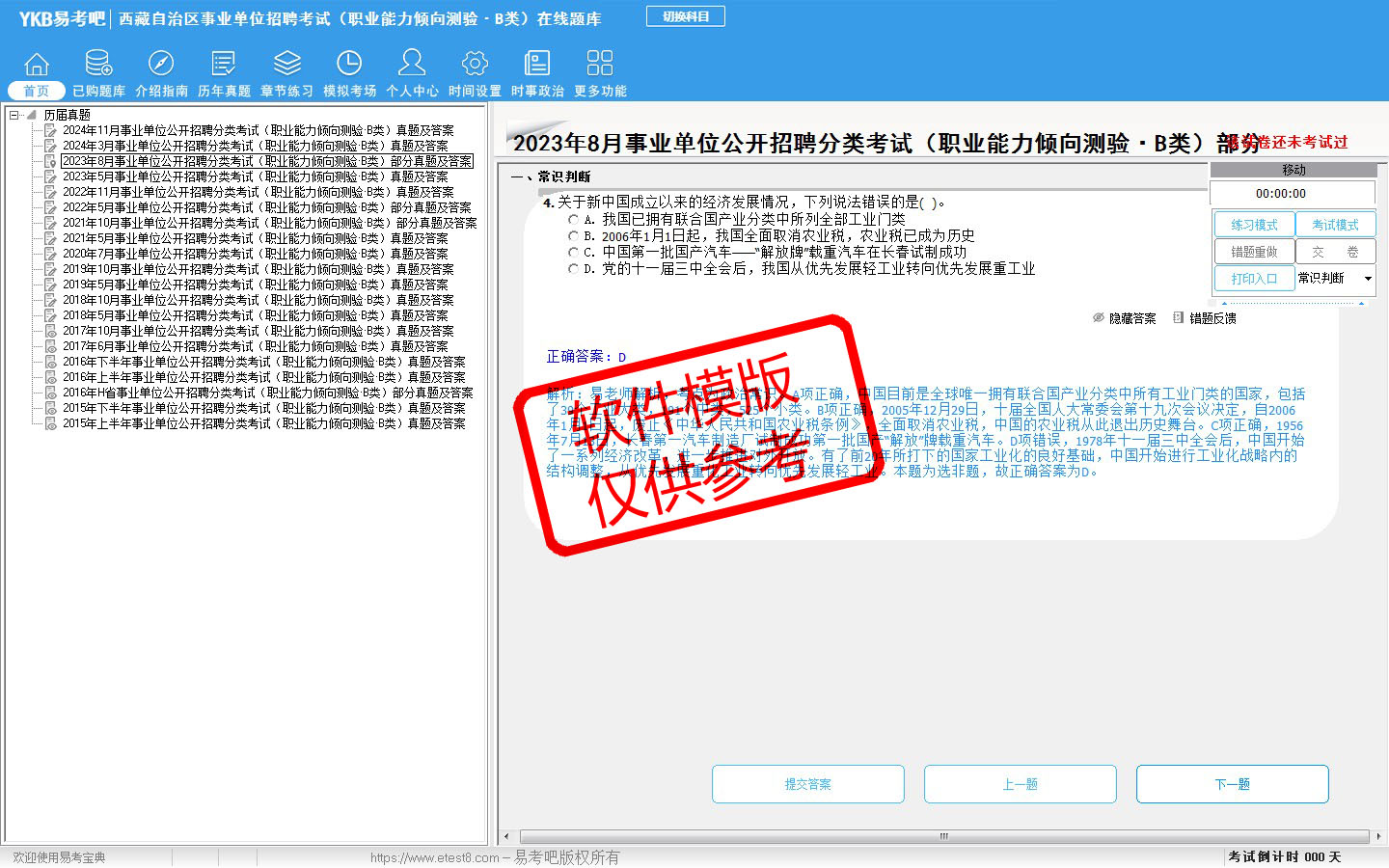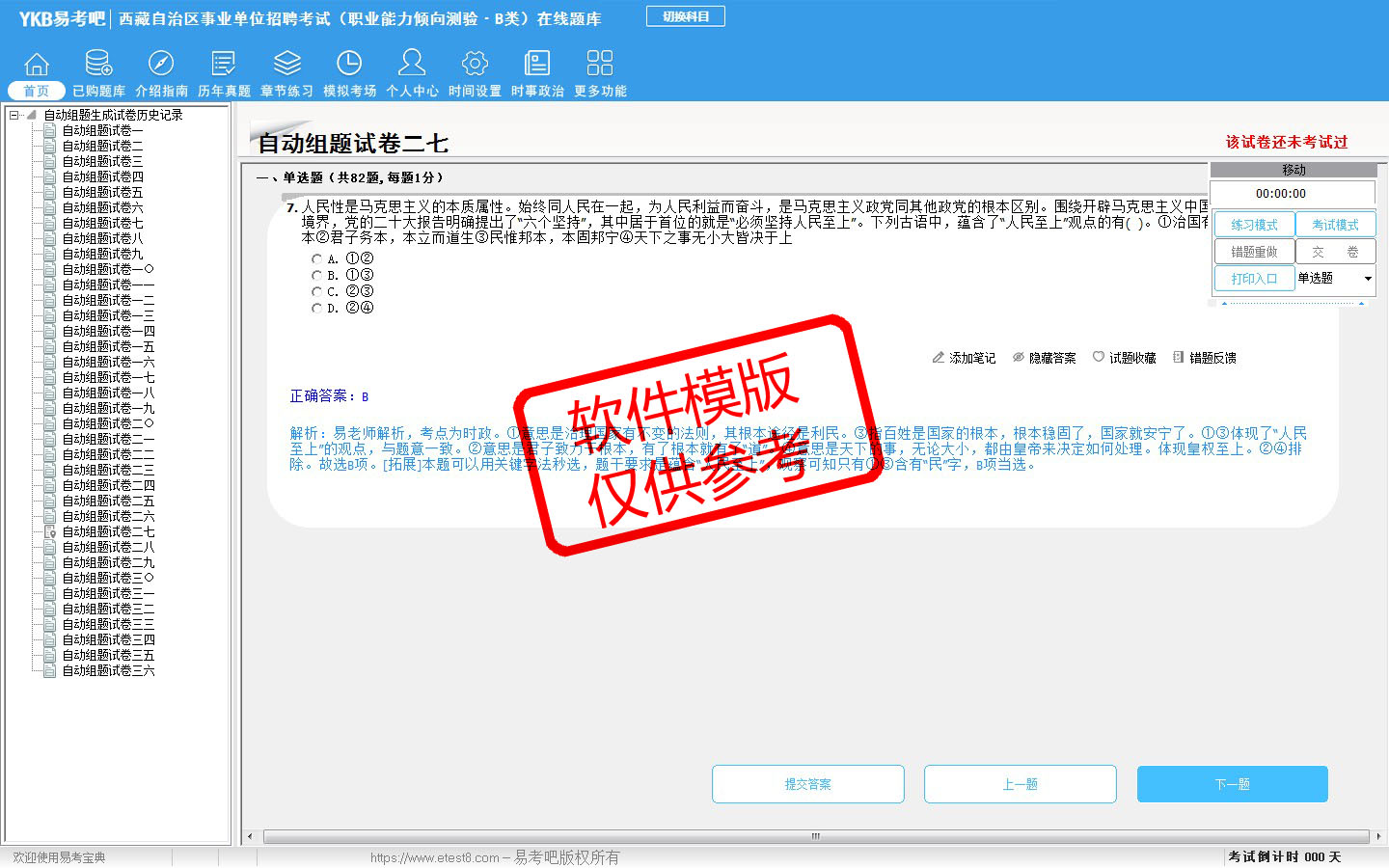 2026年西藏自治区事业单位招聘考试(社会科学专技类·B类)易考宝典软件(含2科)(手机/网页版)是《易考宝典》考试系列软件之一,是专门为参加“事业单位职业资格考试”的朋友量身定做的自我测试系统,是个人、培训学校进行考试前训练、备考冲刺的提分技巧考试平台,题型丰富,图文并茂,内容全面,题库设计符合考试新大纲,海量试题。软件包括了富有价值的模拟考场,有计时打分等功能,就像亲身体会考试一样。