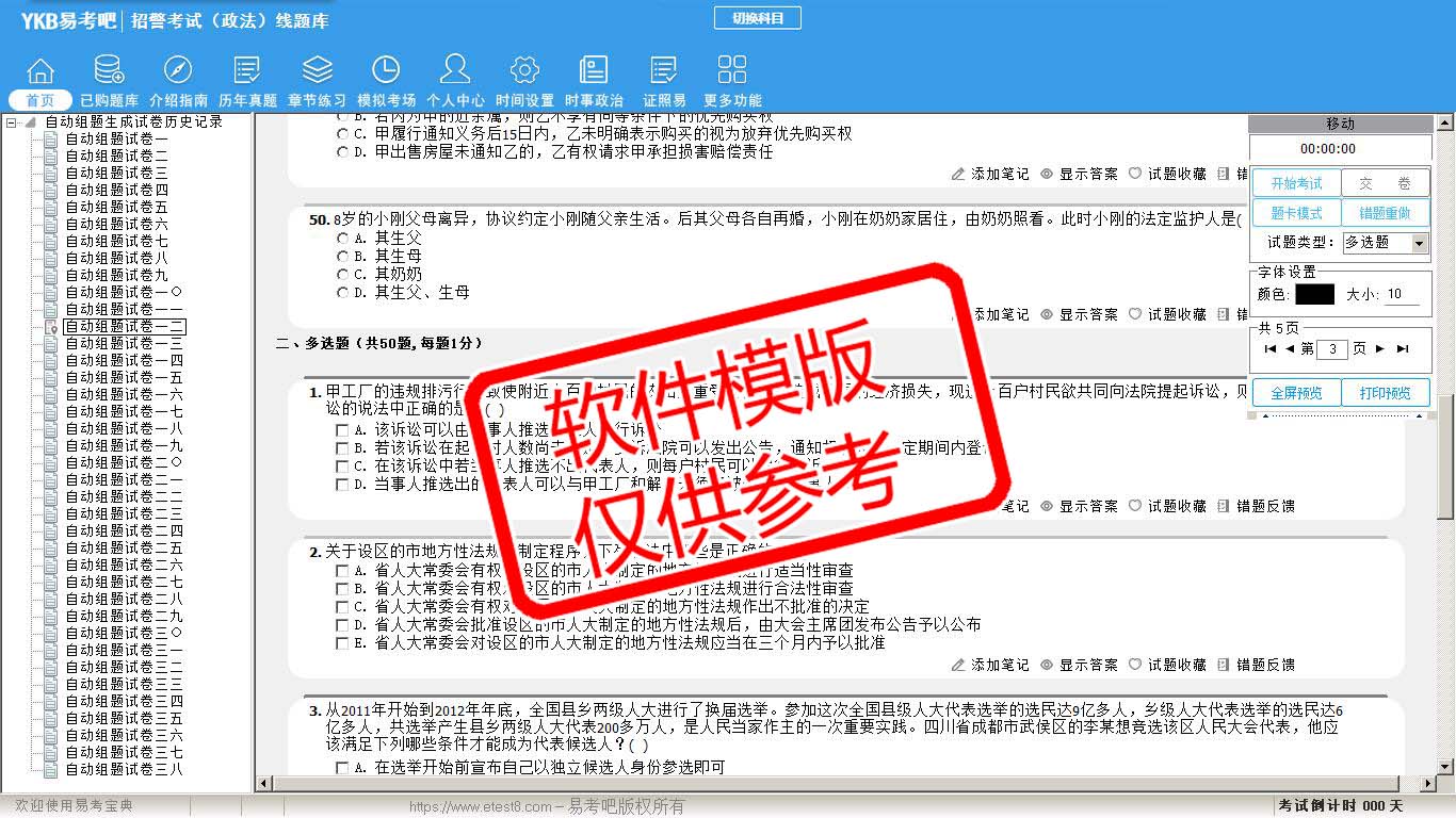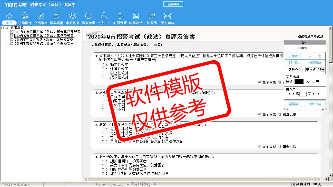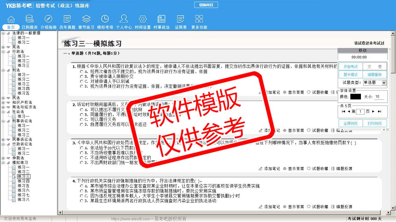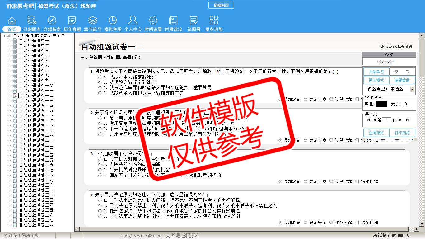 2026年招警考试(政法)易考宝典软件(手机/网页版)是《易考宝典》考试系列软件之一,是专门为参加“警法考试职业资格考试”的朋友量身定做的自我测试系统,是个人、培训学校进行考试前训练、备考冲刺的提分技巧考试平台,题型丰富,图文并茂,内容全面,题库设计符合考试新大纲,海量试题。软件包括了富有价值的模拟考场,有计时打分等功能,就像亲身体会考试一样。