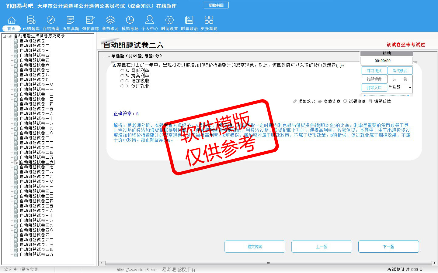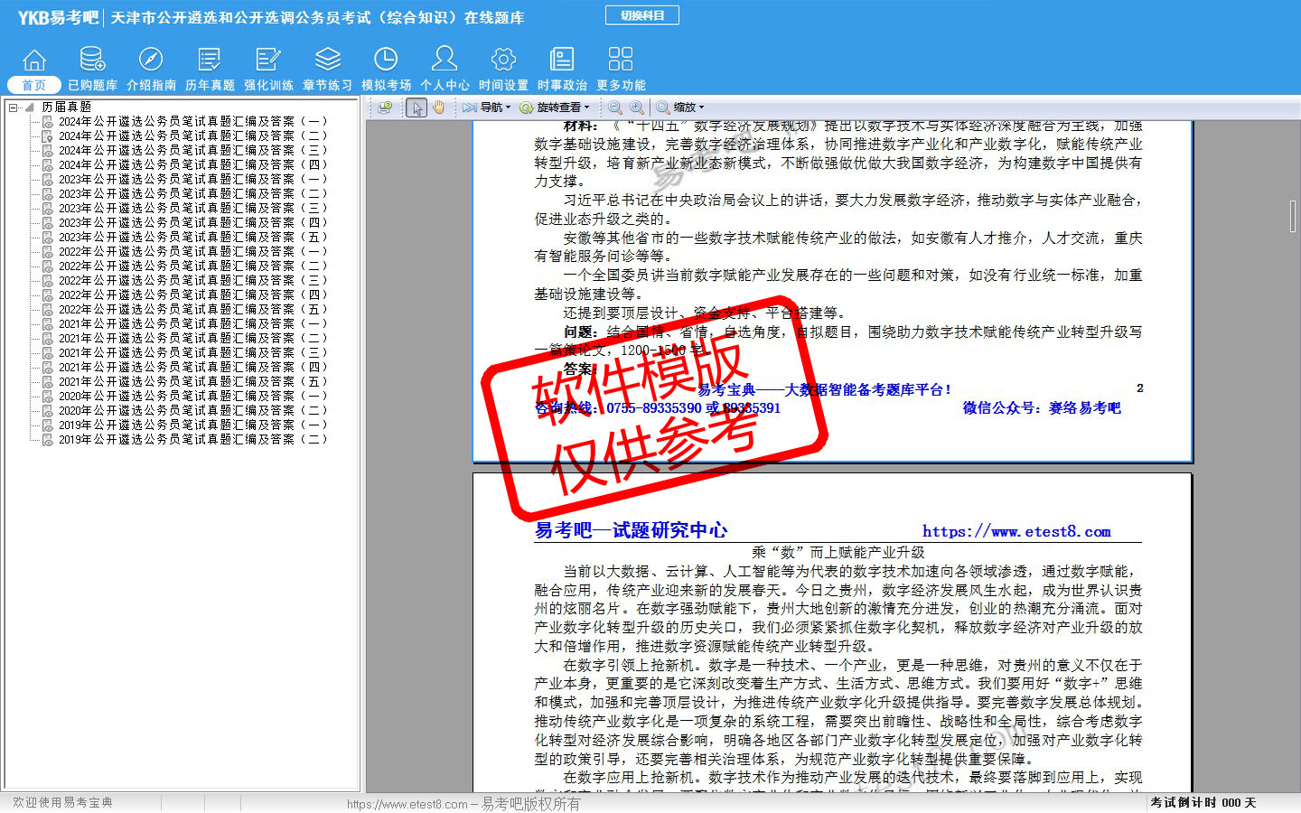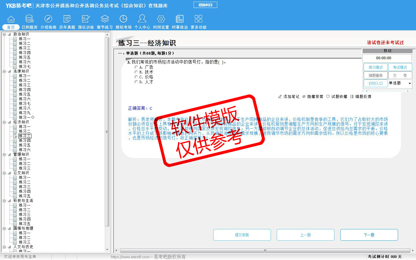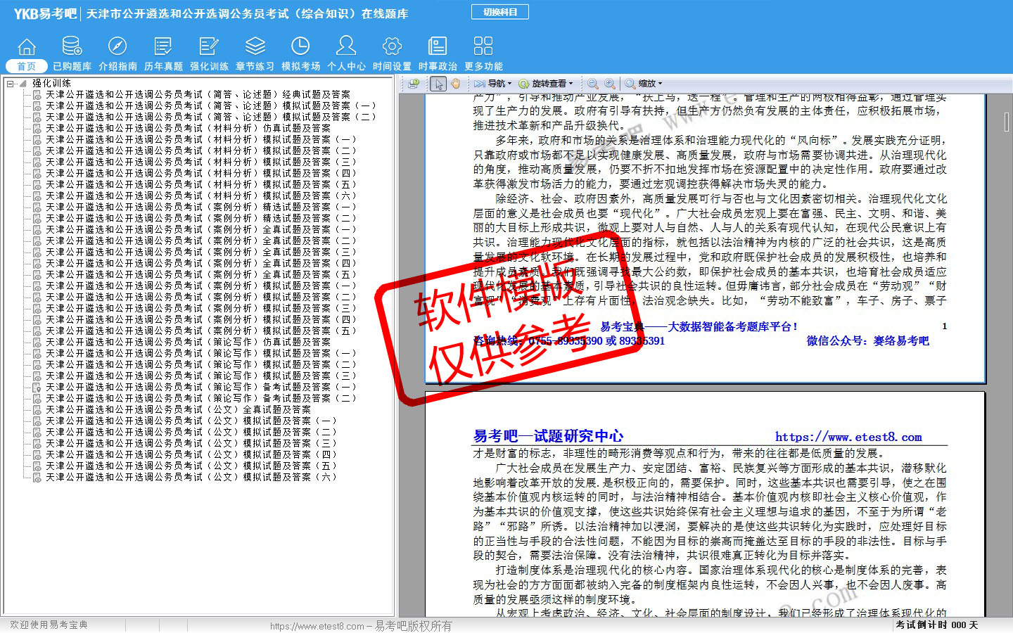 2026年天津市公开遴选和公开选调公务员考试(综合知识)易考宝典软件(手机/网页版)是《易考宝典》考试系列软件之一,是专门为参加“公选遴选职业资格考试”的朋友量身定做的自我测试系统,是个人、培训学校进行考试前训练、备考冲刺的提分技巧考试平台,题型丰富,图文并茂,内容全面,题库设计符合考试新大纲,海量试题。软件包括了富有价值的模拟考场,有计时打分等功能,就像亲身体会考试一样。