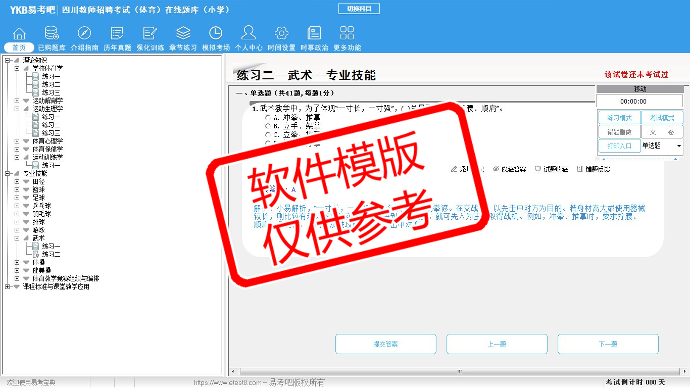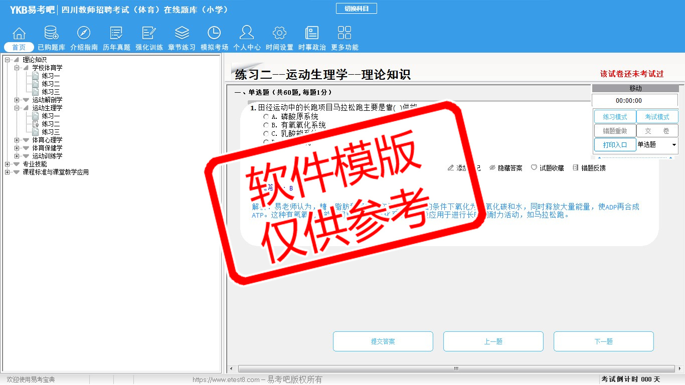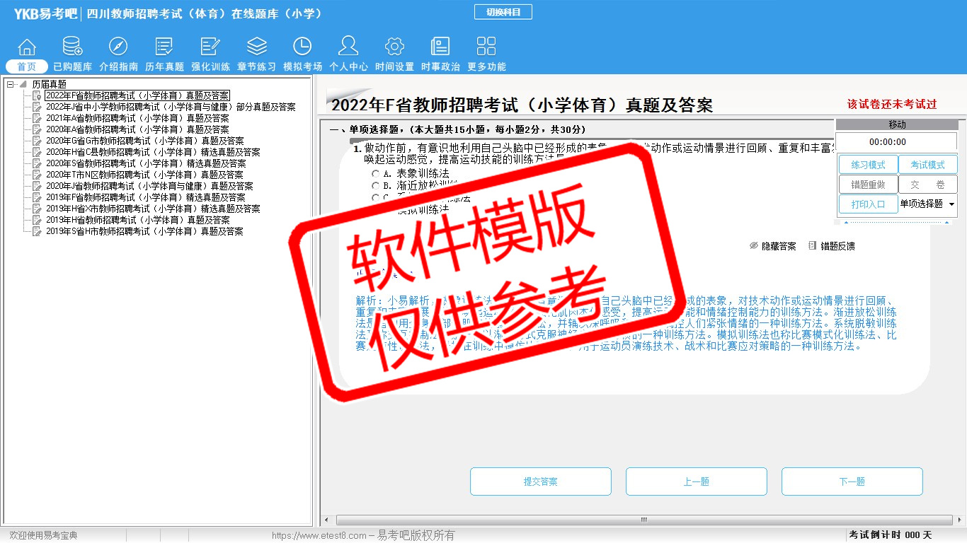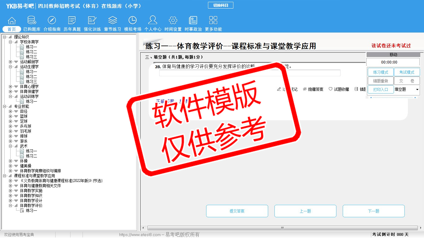 2026年四川教师招聘考试(教育公共基础+体育)易考宝典软件(小学)(手机/网页版)是《易考宝典》考试系列软件之一,是专门为参加“教师招聘职业资格考试”的朋友量身定做的自我测试系统,是个人、培训学校进行考试前训练、备考冲刺的提分技巧考试平台,题型丰富,图文并茂,内容全面,题库设计符合考试新大纲,海量试题。软件包括了富有价值的模拟考场,有计时打分等功能,就像亲身体会考试一样。