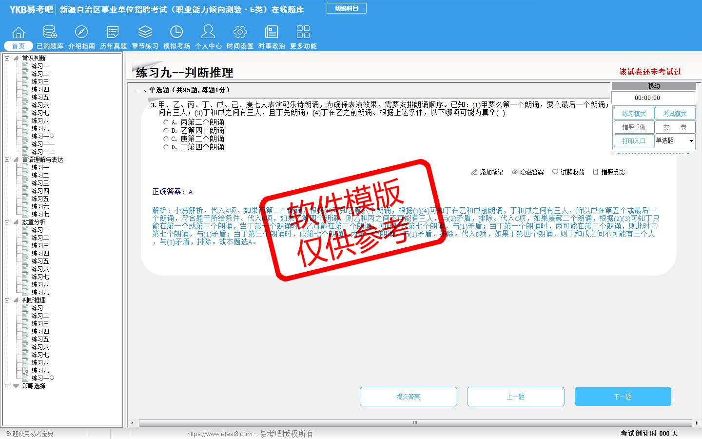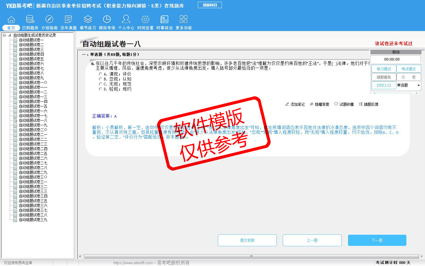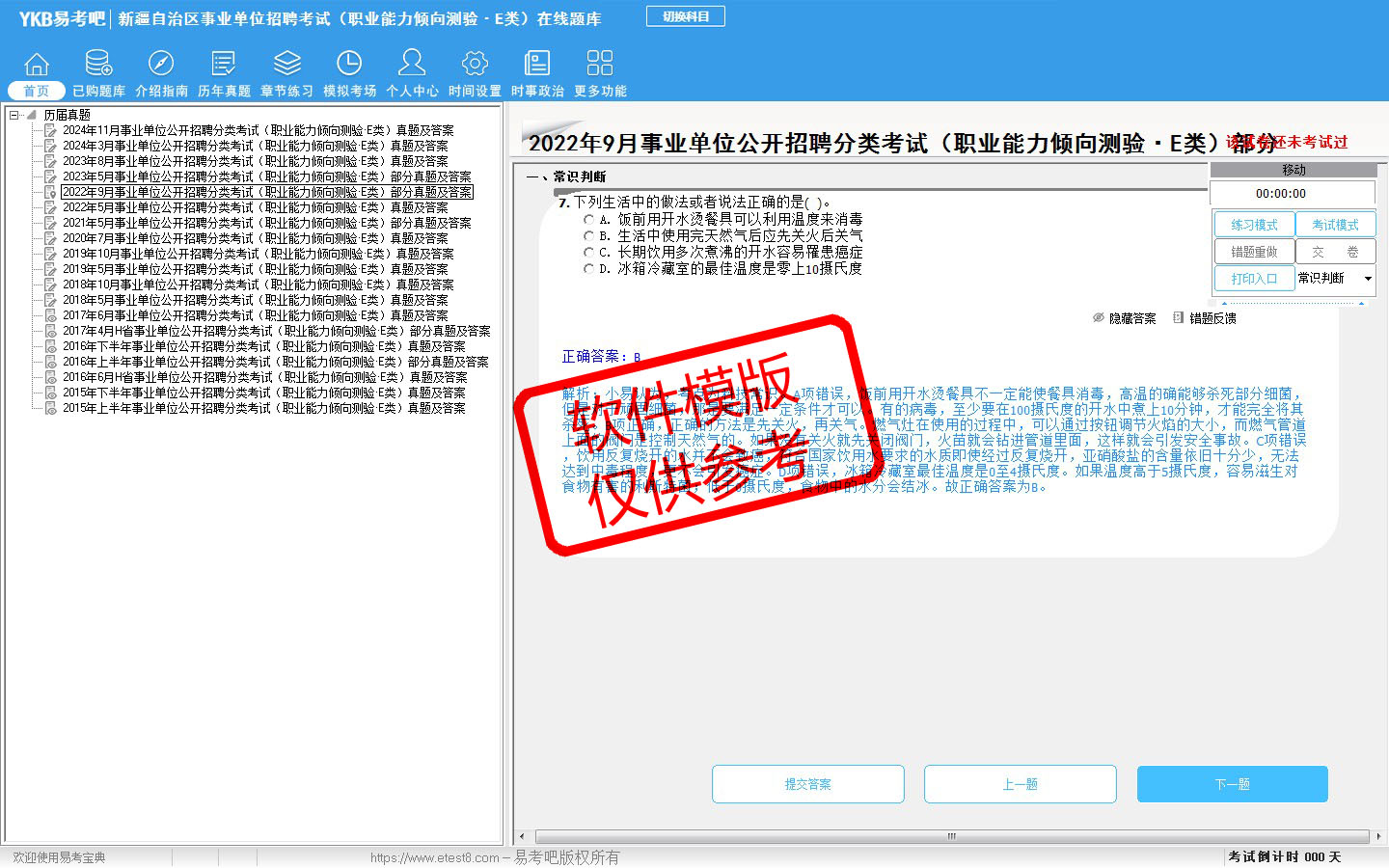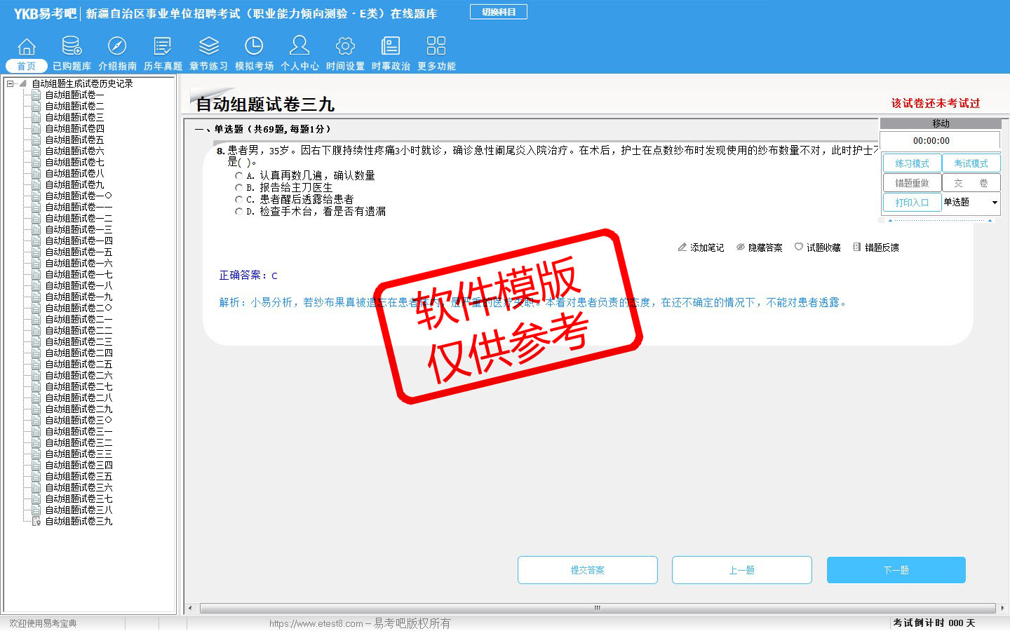 2026年新疆自治区事业单位招聘考试(医疗卫生类·E类)易考宝典软件(含2科)(手机/网页版)是《易考宝典》考试系列软件之一,是专门为参加“事业单位职业资格考试”的朋友量身定做的自我测试系统,是个人、培训学校进行考试前训练、备考冲刺的提分技巧考试平台,题型丰富,图文并茂,内容全面,题库设计符合考试新大纲,海量试题。软件包括了富有价值的模拟考场,有计时打分等功能,就像亲身体会考试一样。