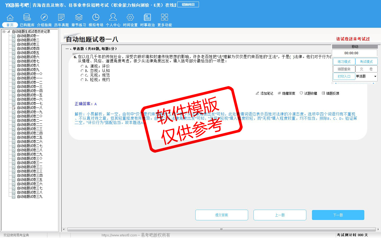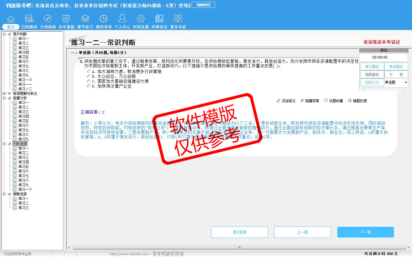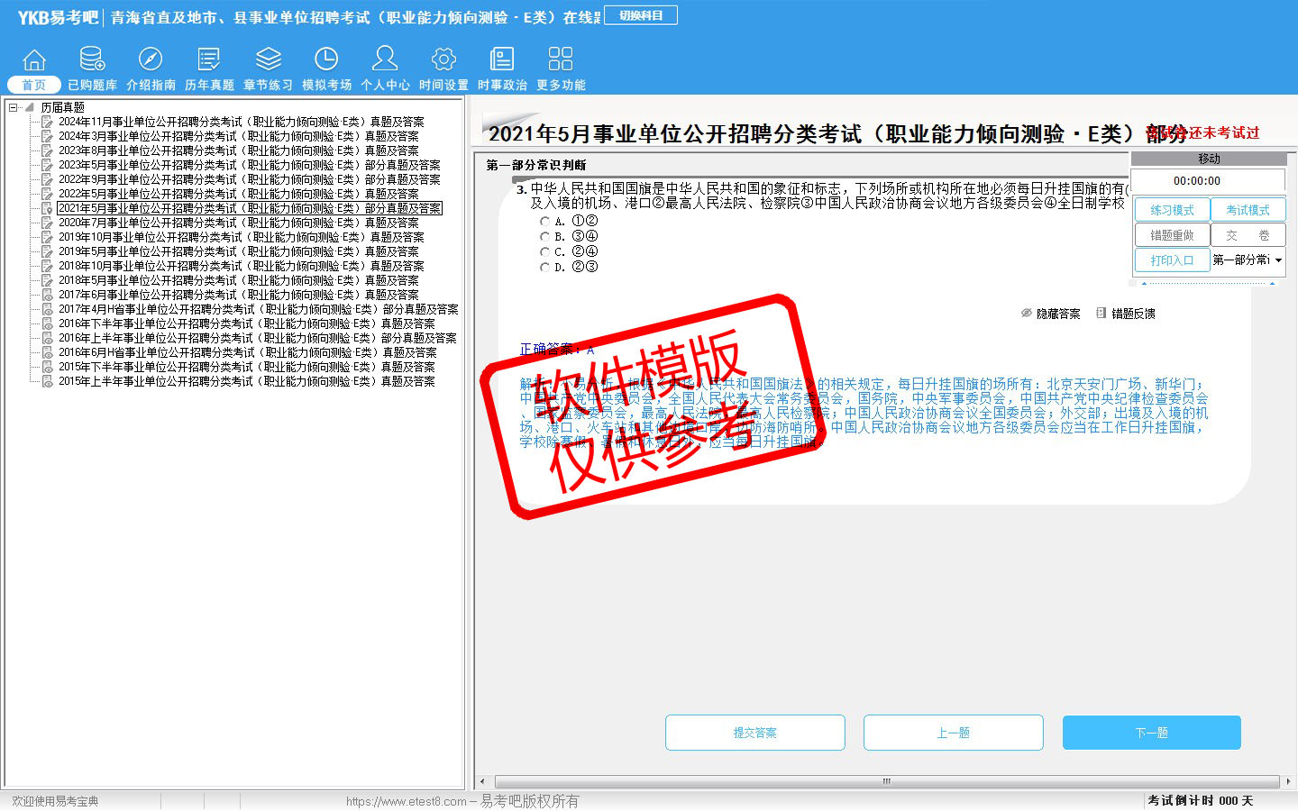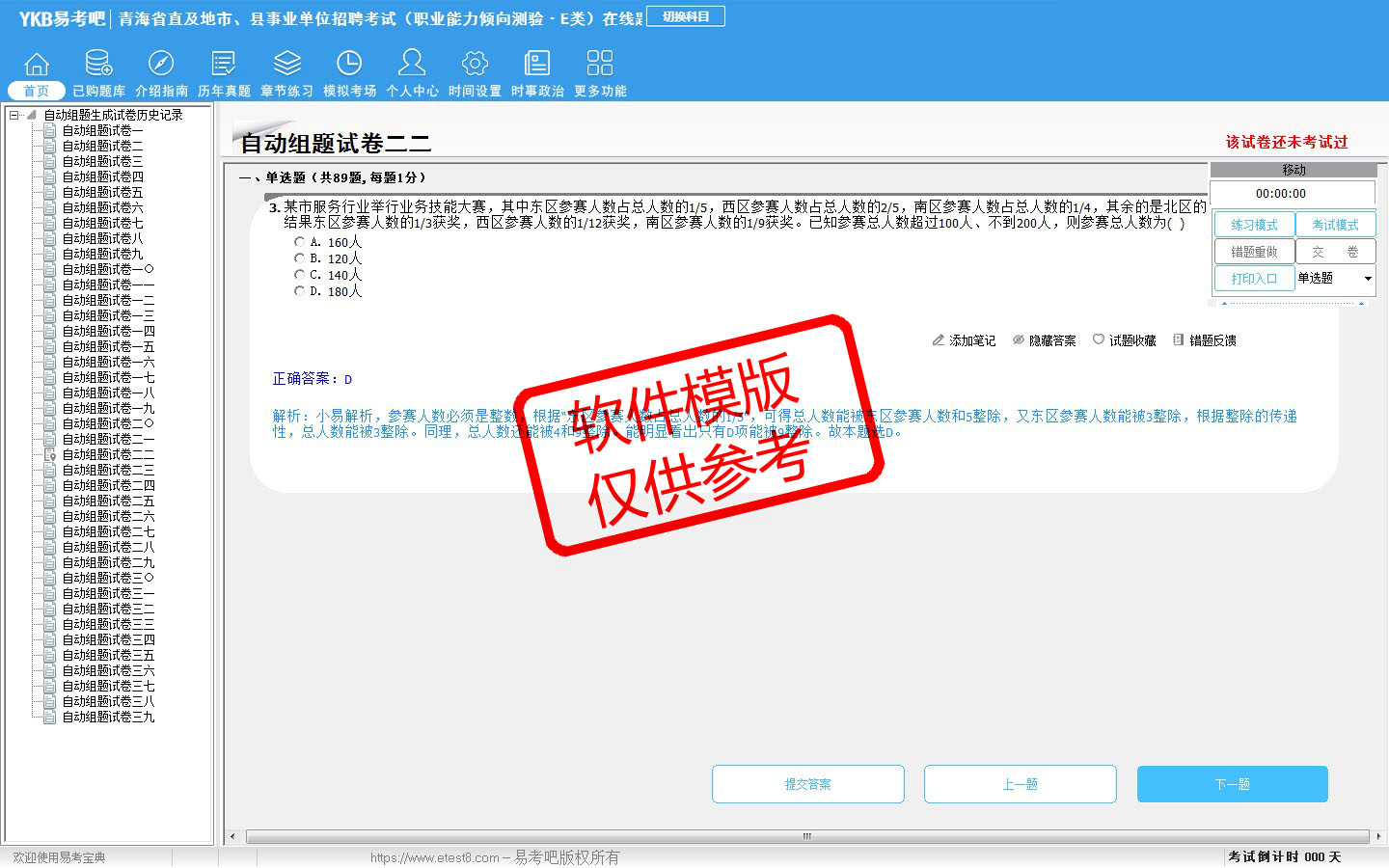 2026年青海省直及地市、县事业单位招聘考试(职业能力倾向测验·E类)易考宝典软件(手机/网页版)是《易考宝典》考试系列软件之一,是专门为参加“事业单位职业资格考试”的朋友量身定做的自我测试系统,是个人、培训学校进行考试前训练、备考冲刺的提分技巧考试平台,题型丰富,图文并茂,内容全面,题库设计符合考试新大纲,海量试题。软件包括了富有价值的模拟考场,有计时打分等功能,就像亲身体会考试一样。